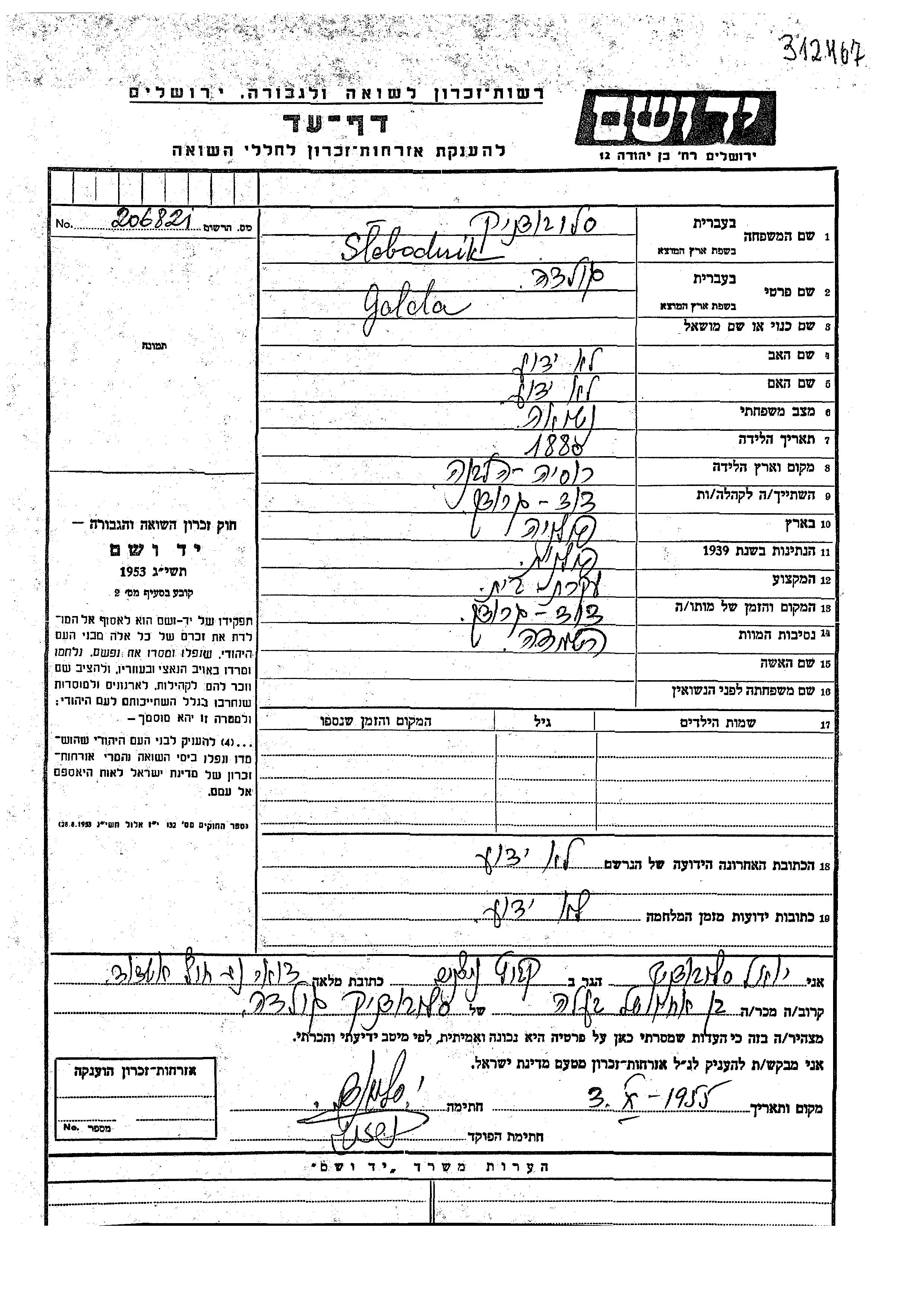 Голда Слободник, место рождения: Россия (СССР). Домохозяйка. Женат / замужем. Место жительства до войны: Грудек, Польша.
