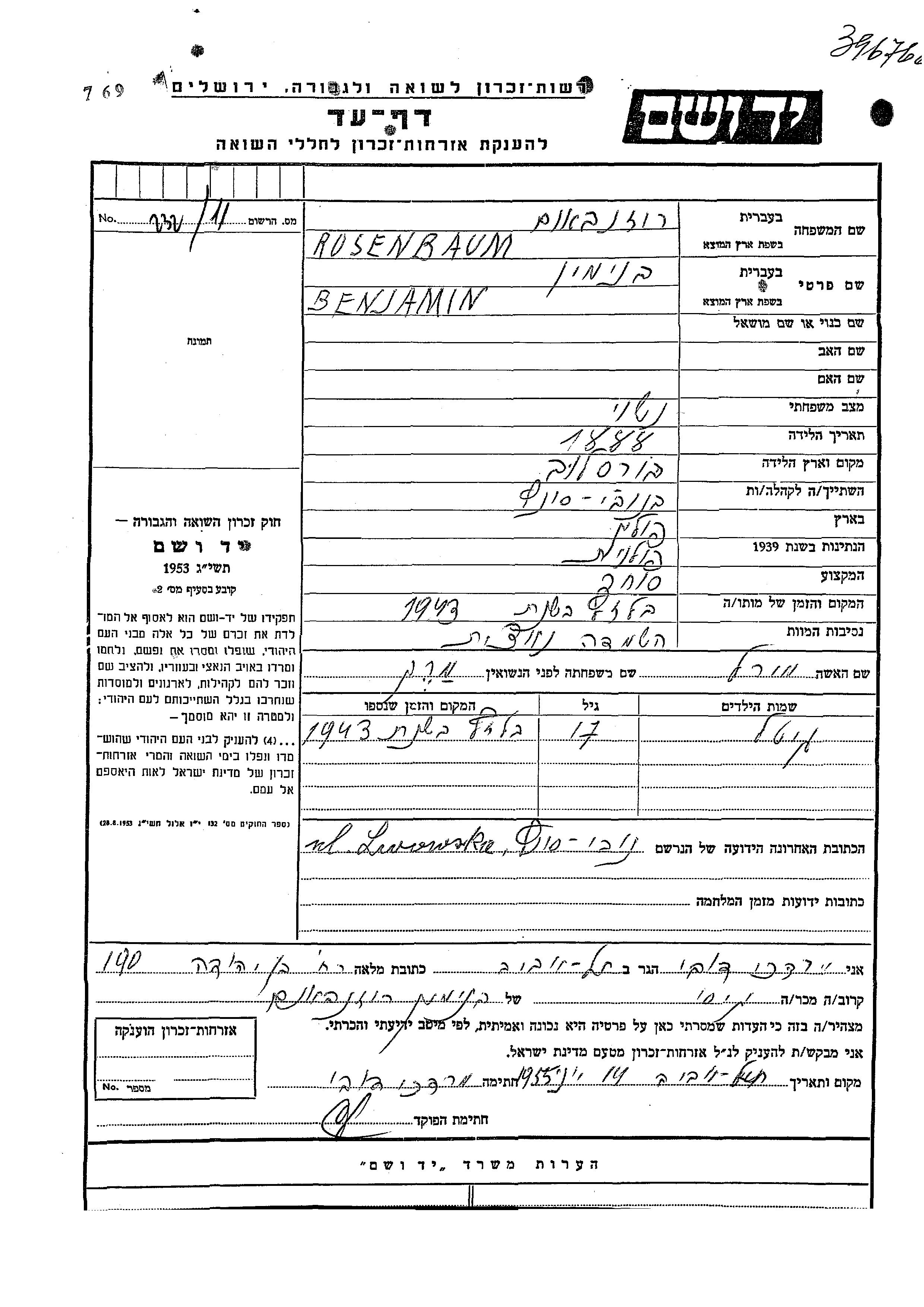 Розенбаум Беньямин 1888 Нови-Сад, Югославия Лист свидетельских показаний