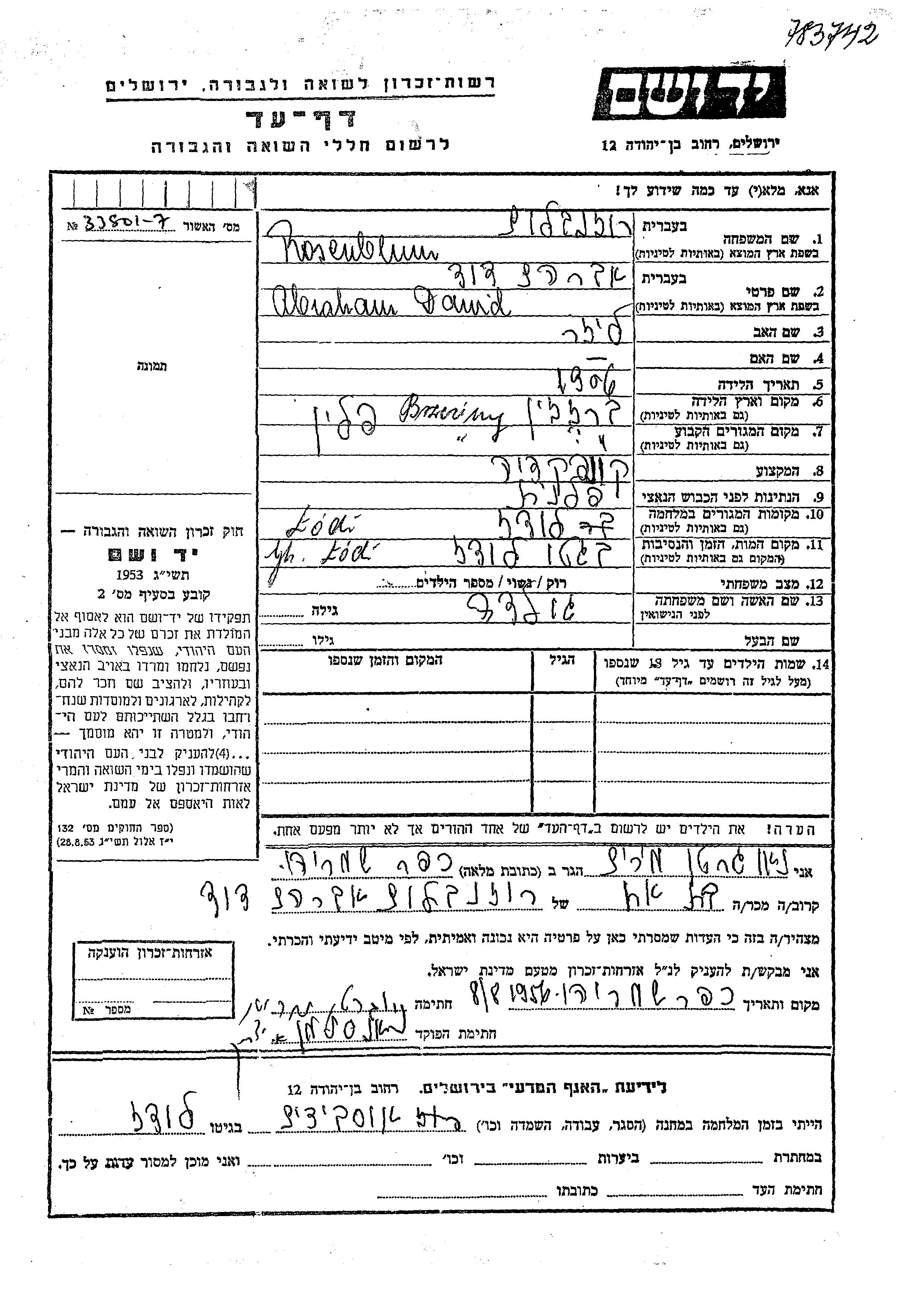 Розенблюм Абраам Давид 1906 Бжезина, Польша Лист свидетельских показаний