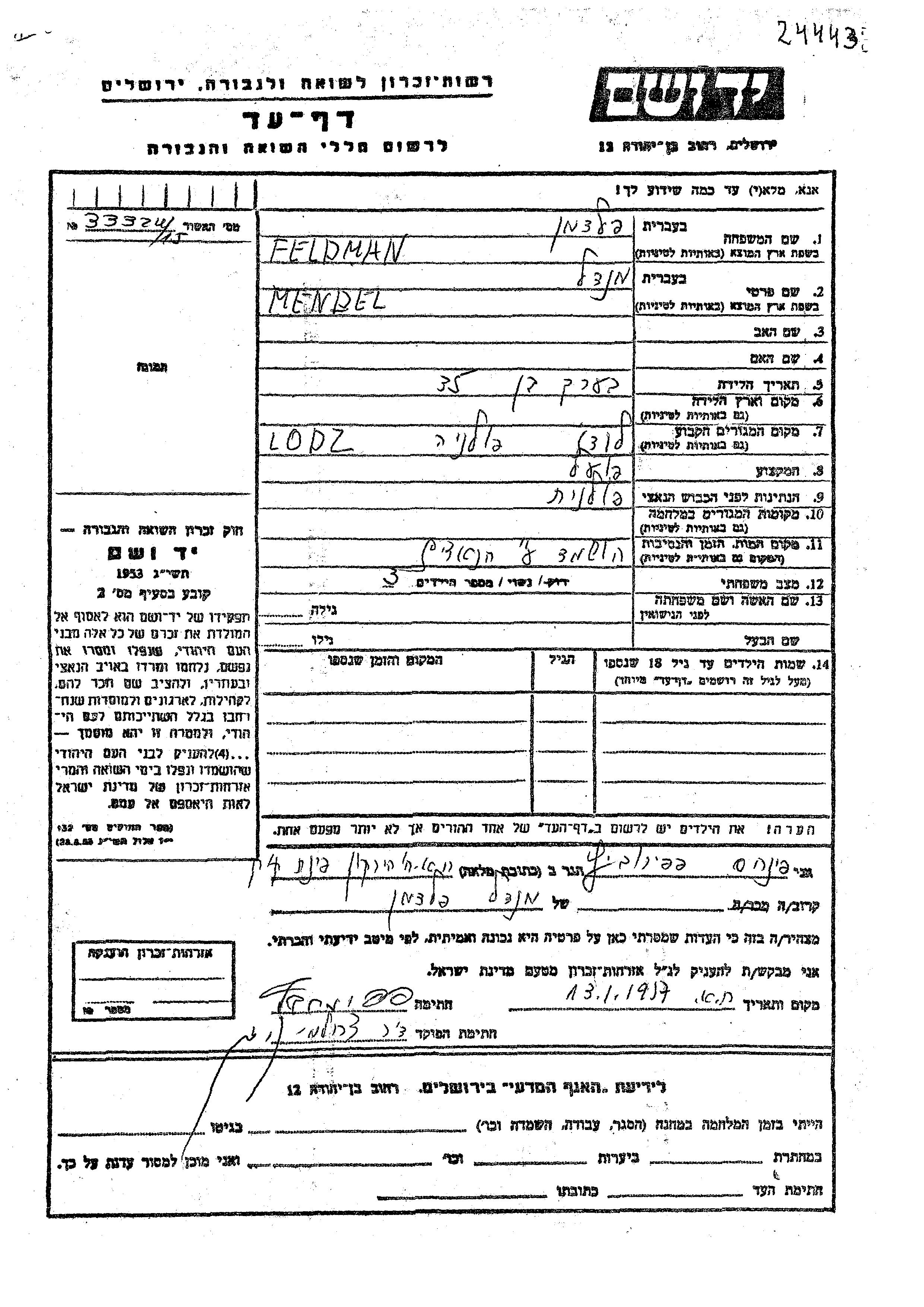 Фельдман Мендель Лодзь, Польша Лист свидетельских показаний