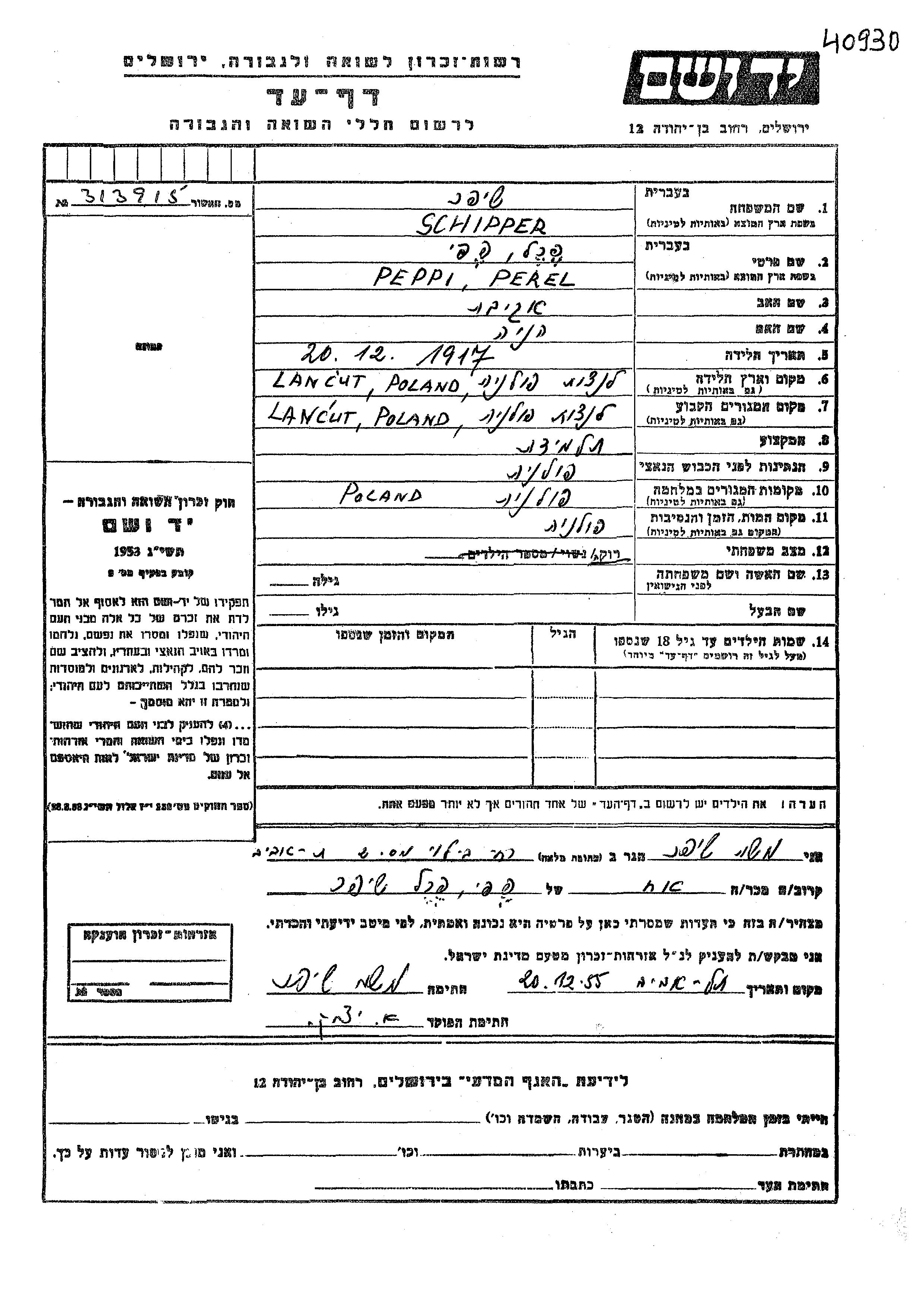 Пеппи Перел Шиппер, место рождения: Ланьцут, Польша. Отец: Акива, mать:Хеня. Ученик / ученица. Холост / не замужем. Место жительства до войны: Ланьцут, Польша. Место во время войны: Польша.