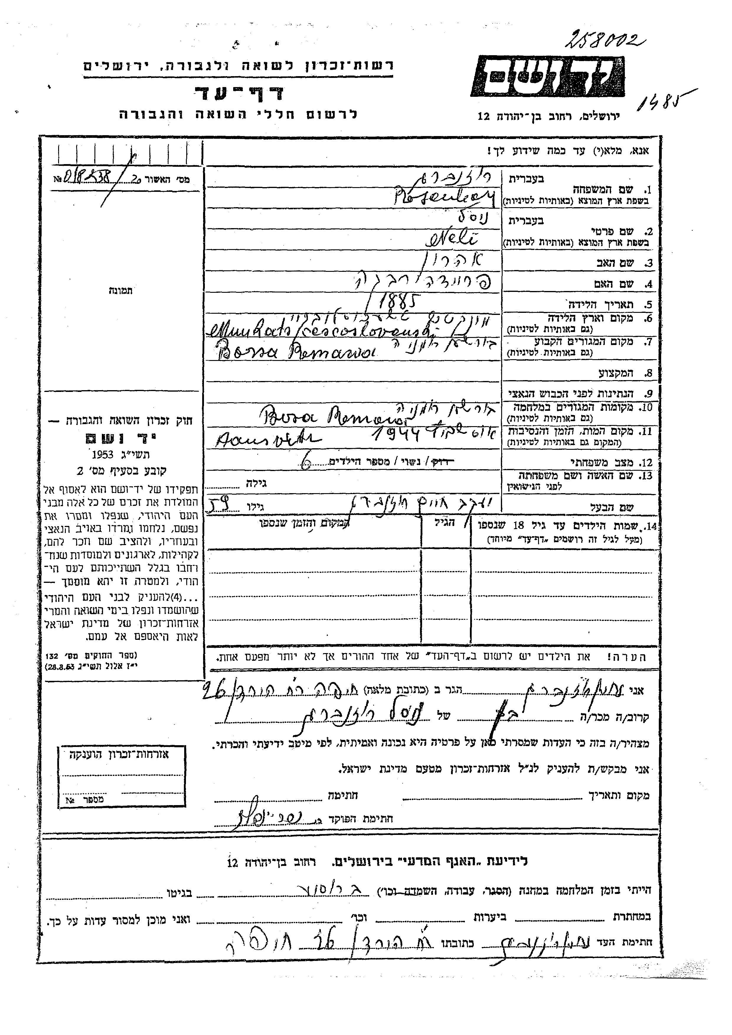 Розенберг Нели Нисель 1885 Борша, Румыния Лист свидетельских показаний