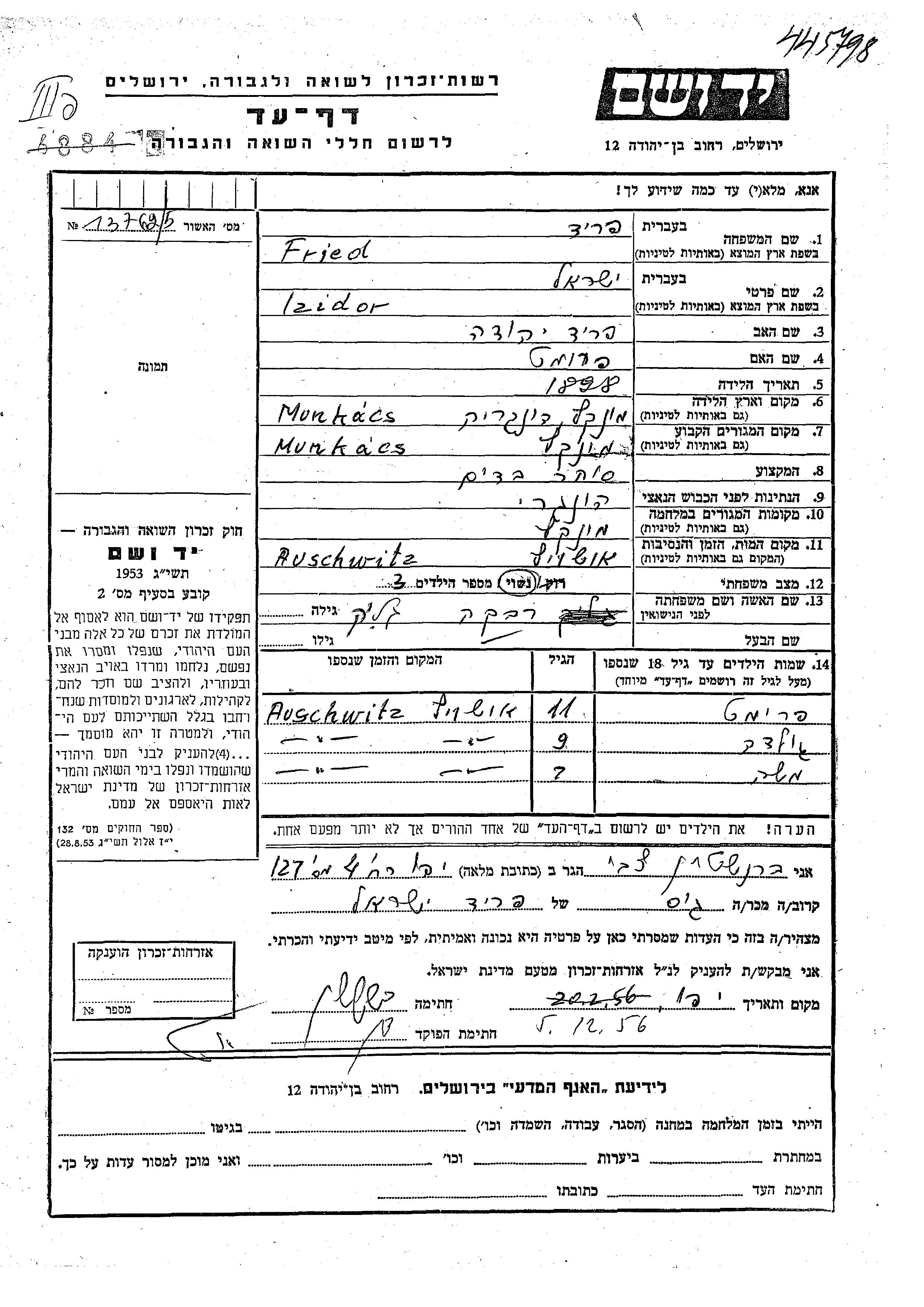 Фрид Исидор Исраэль 1898 Мункач, Чехословакия Лист свидетельских показаний