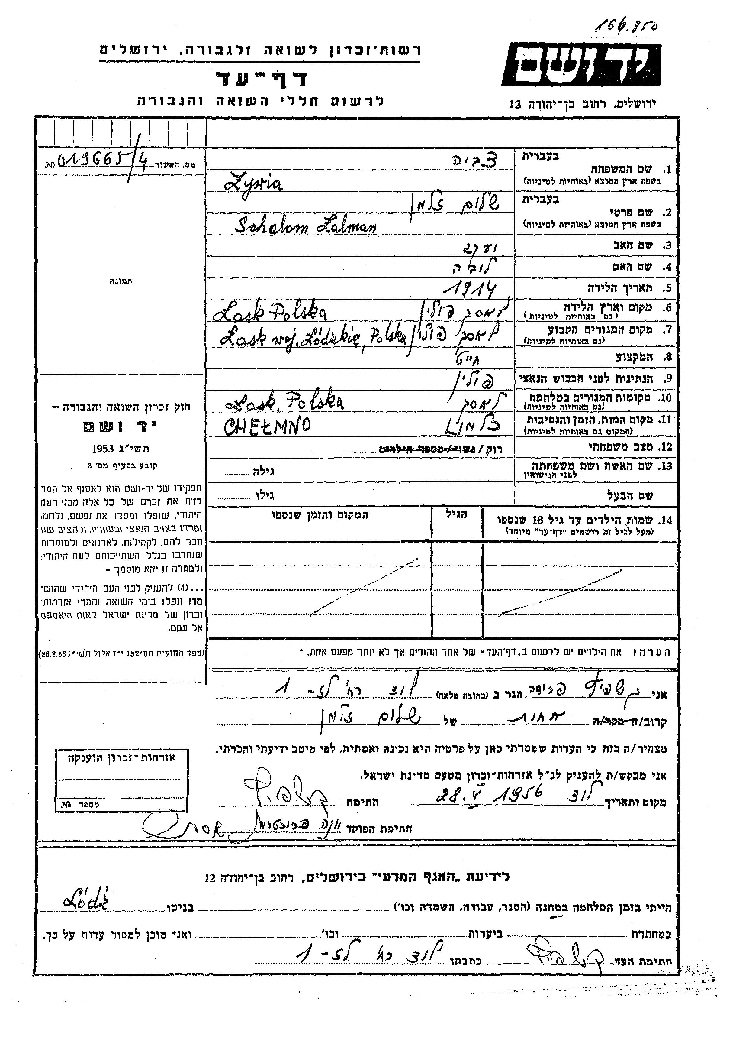 Цывя Шалом Залман 1914 Ласк, Польша Лист свидетельских показаний