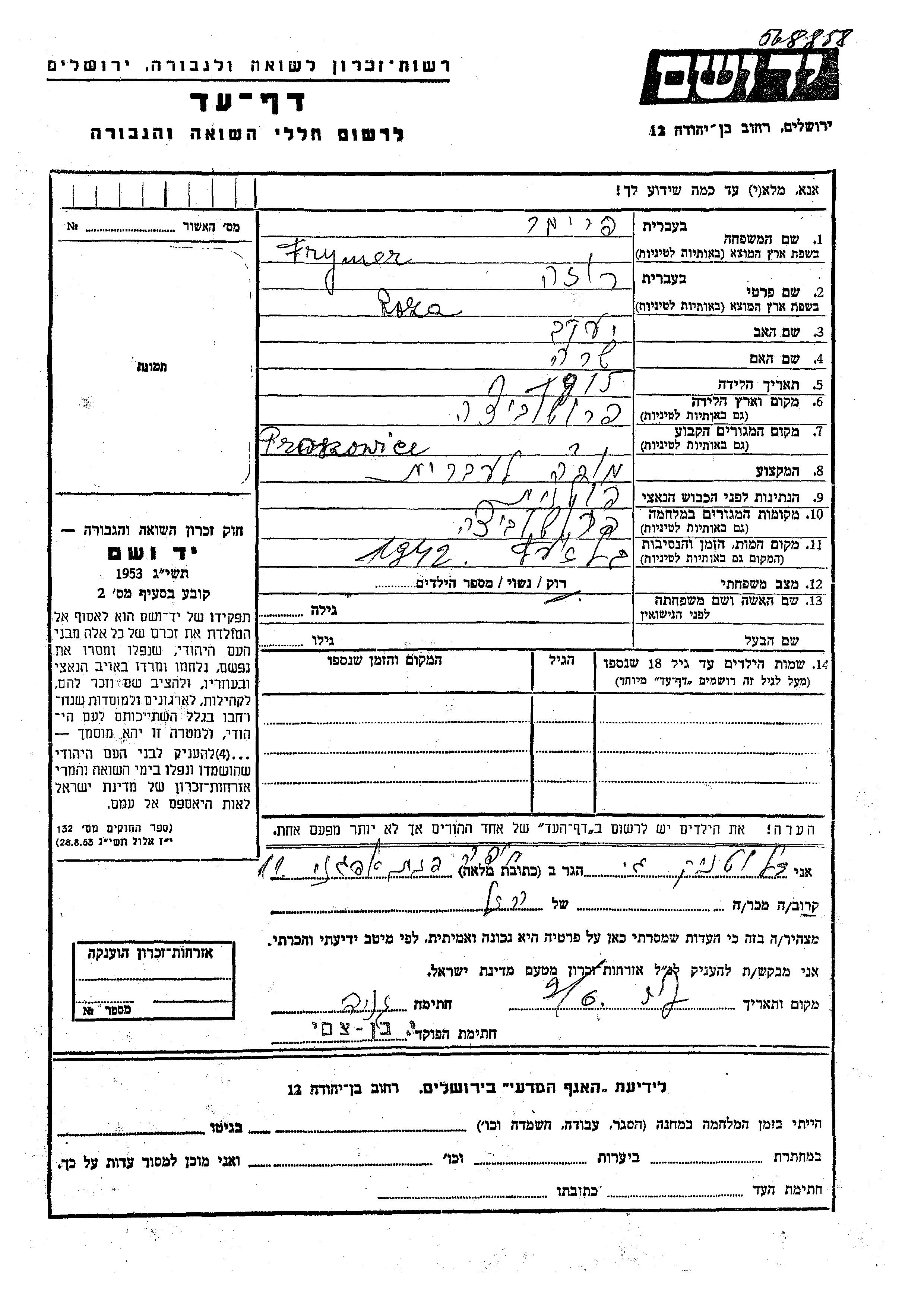 Роза Фример, место рождения: Прошовице, Польша. Отец: Яков, mать:Сара. Учитель / учительница. Холост / не замужем. Место жительства до войны: Прошовице, Польша. Место во время войны: Прошовице, Польша.