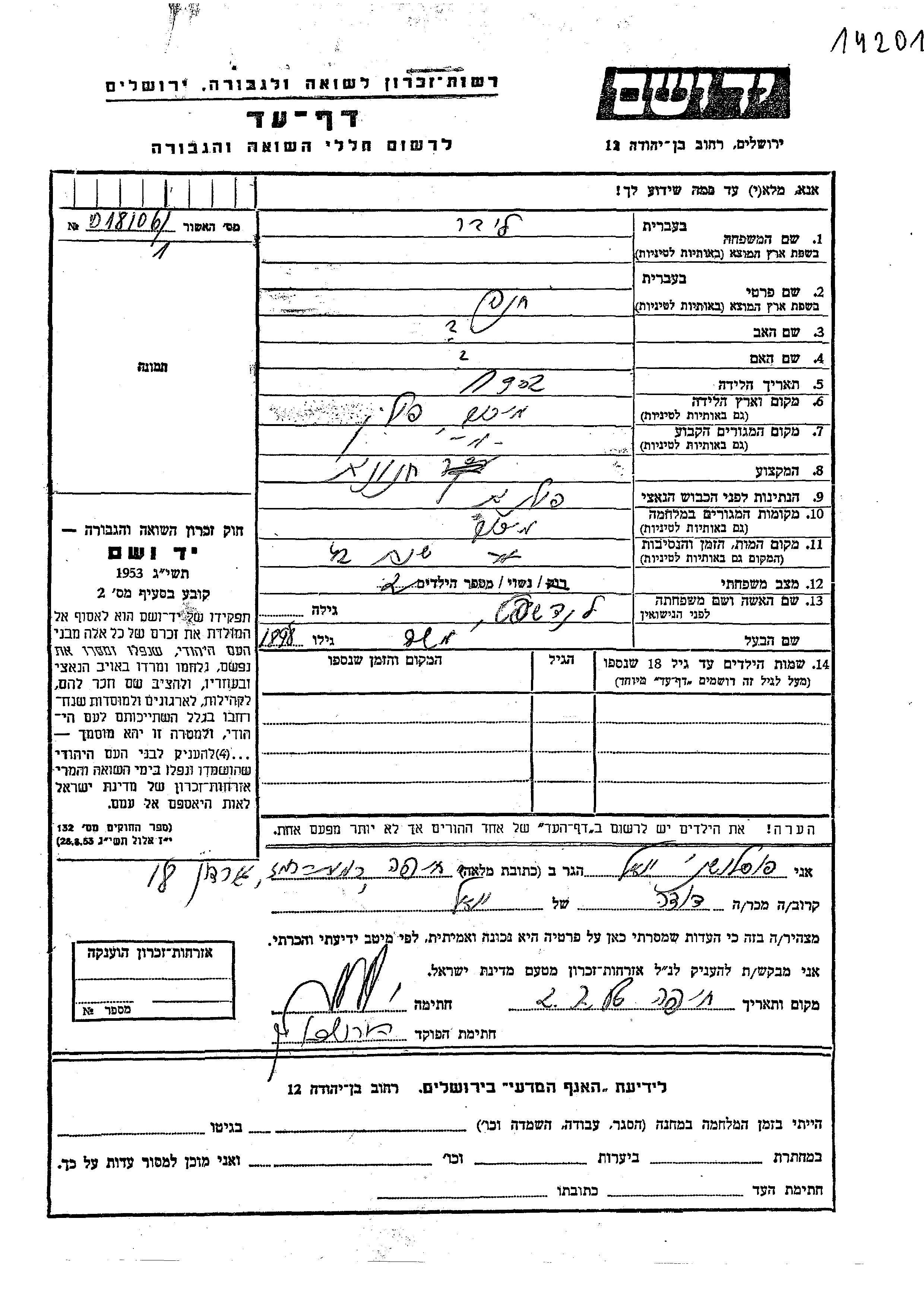 Либер Хана 1902 Михув, Польша Лист свидетельских показаний