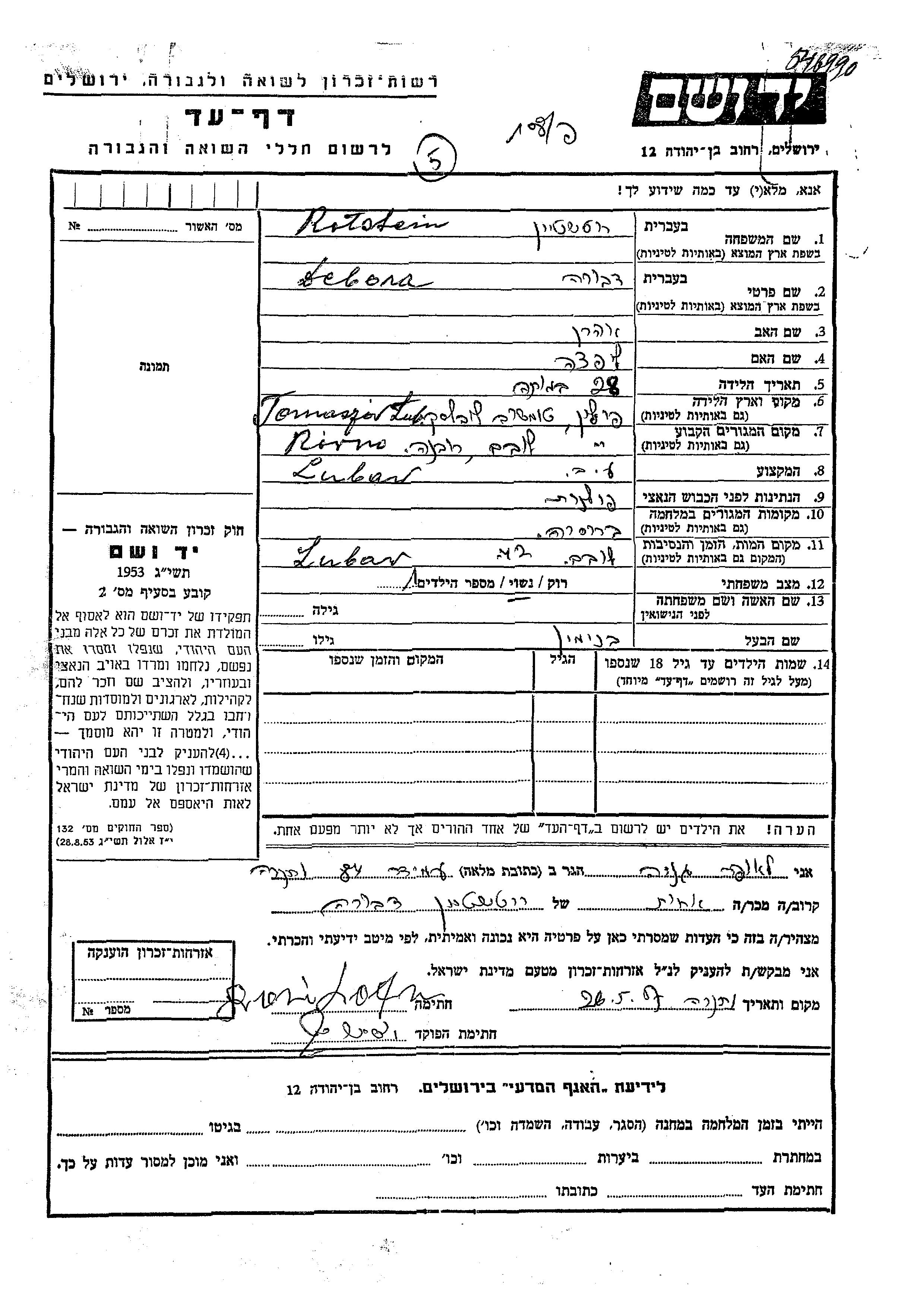 Дебора Ротштайн, место рождения: Томашув-Любельски, Польша. Отец: Арон, mать:Липча. Домохозяйка. Женат / замужем. Место жительства до войны: Любава, Польша. Место во время войны: Россия (СССР).