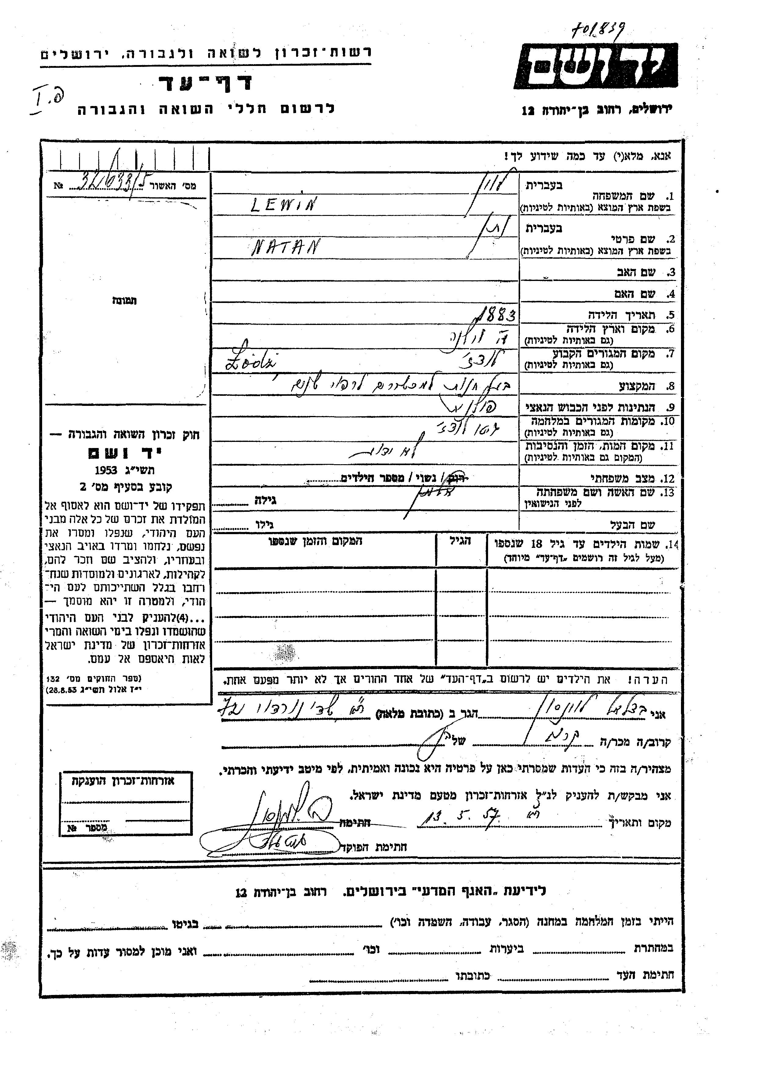 Натан Левин, место рождения: Вильно, Польша. Владелец / владелица магазина. Вдовец. Место жительства до войны: Лодзь, Польша. Место во время войны: Лодзь, Польша.