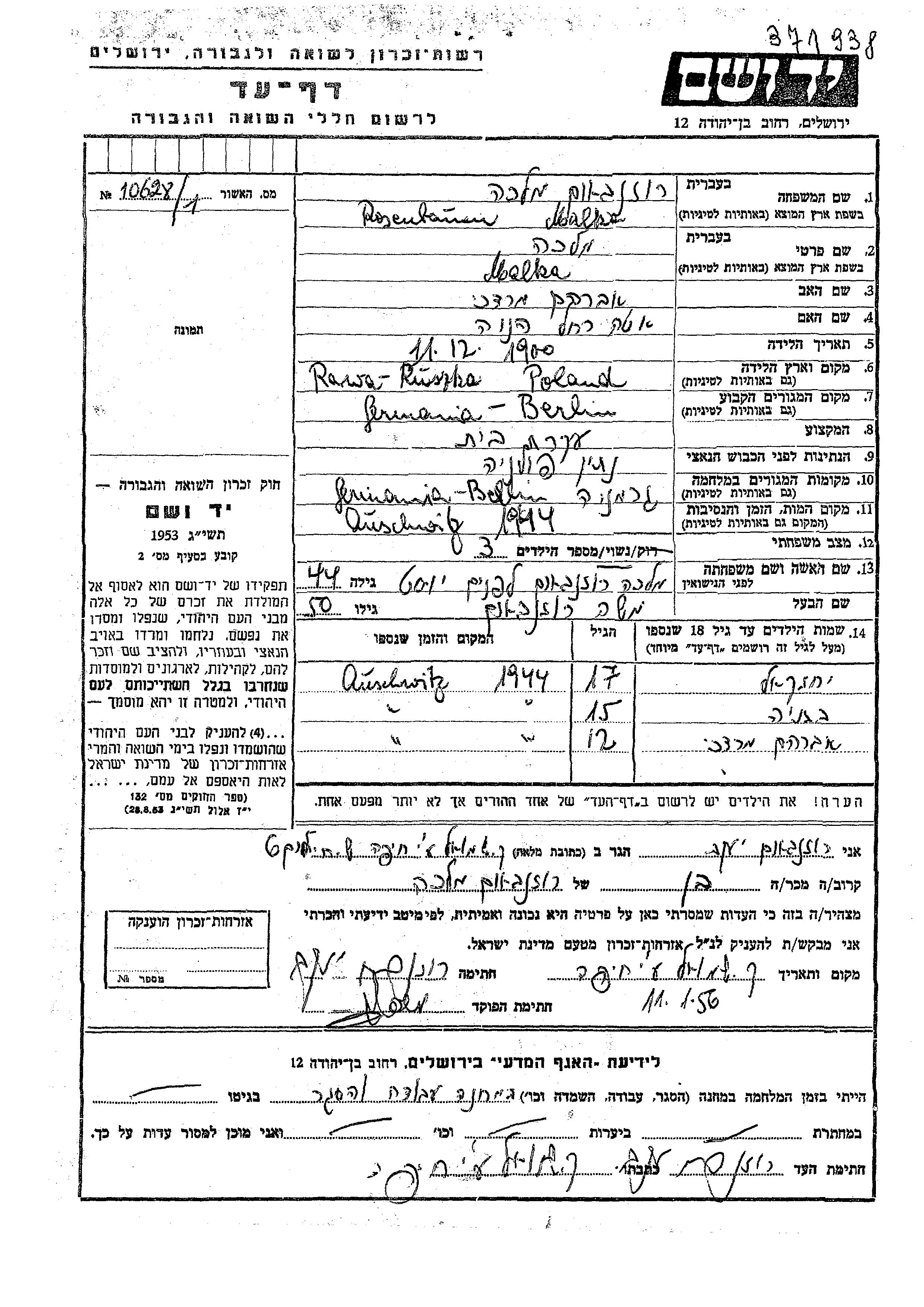 Розенбаум Малка 1900 Берлин, Германия Лист свидетельских показаний