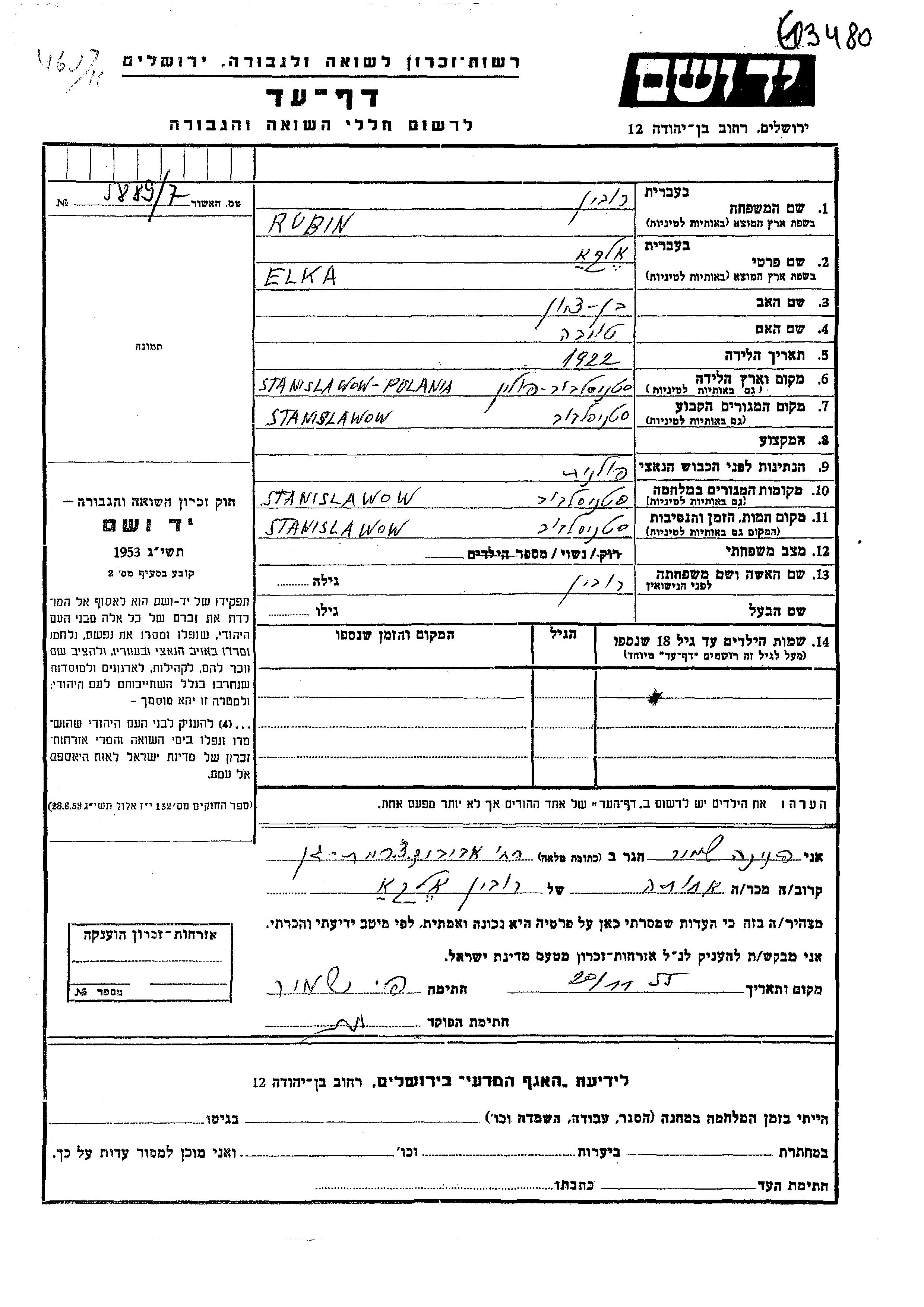 Рубин Элка 1922 Станиславув, Польша Лист свидетельских показаний