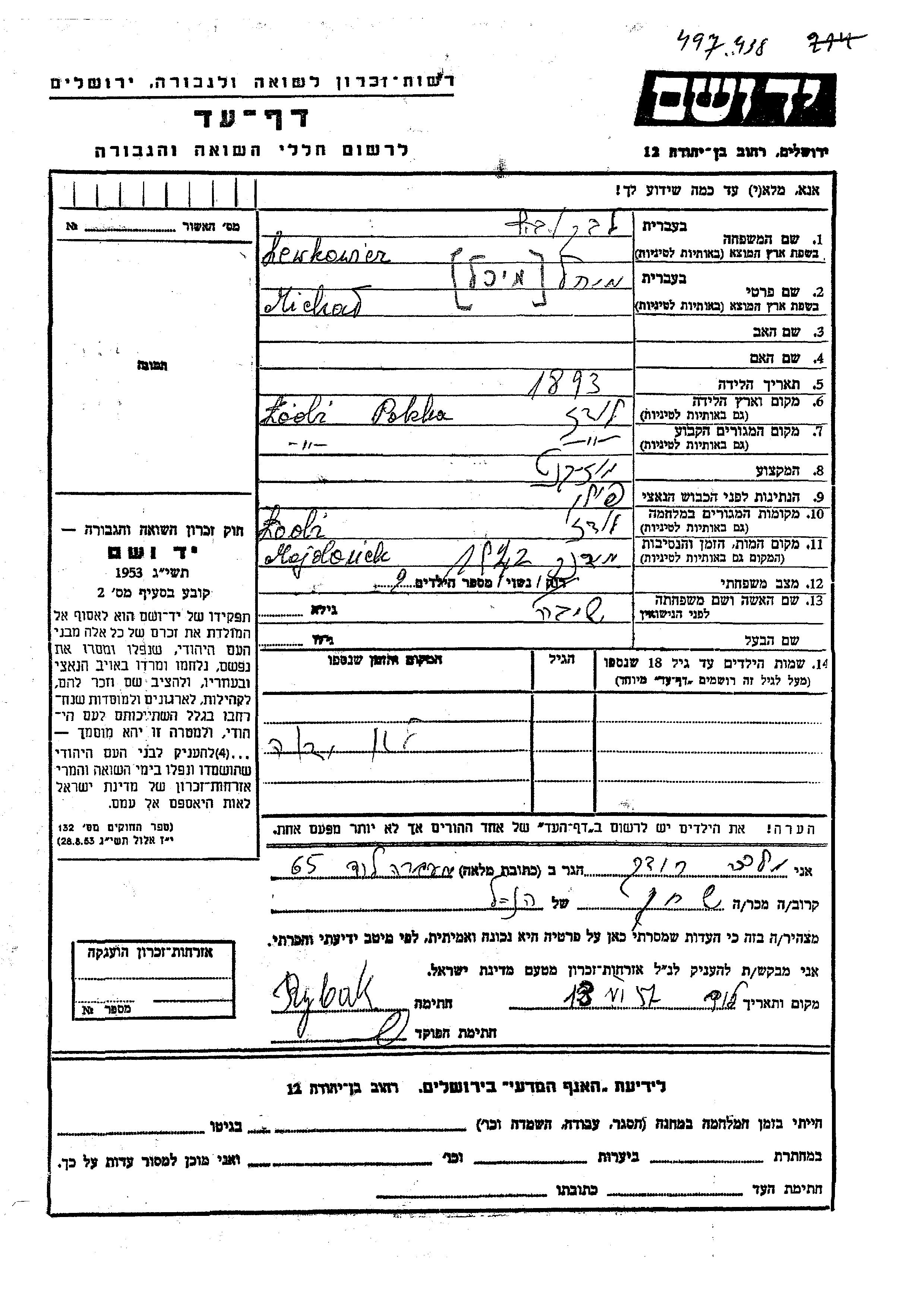 Левкович Михаль Михель 1893 Лодзь, Польша Лист свидетельских показаний