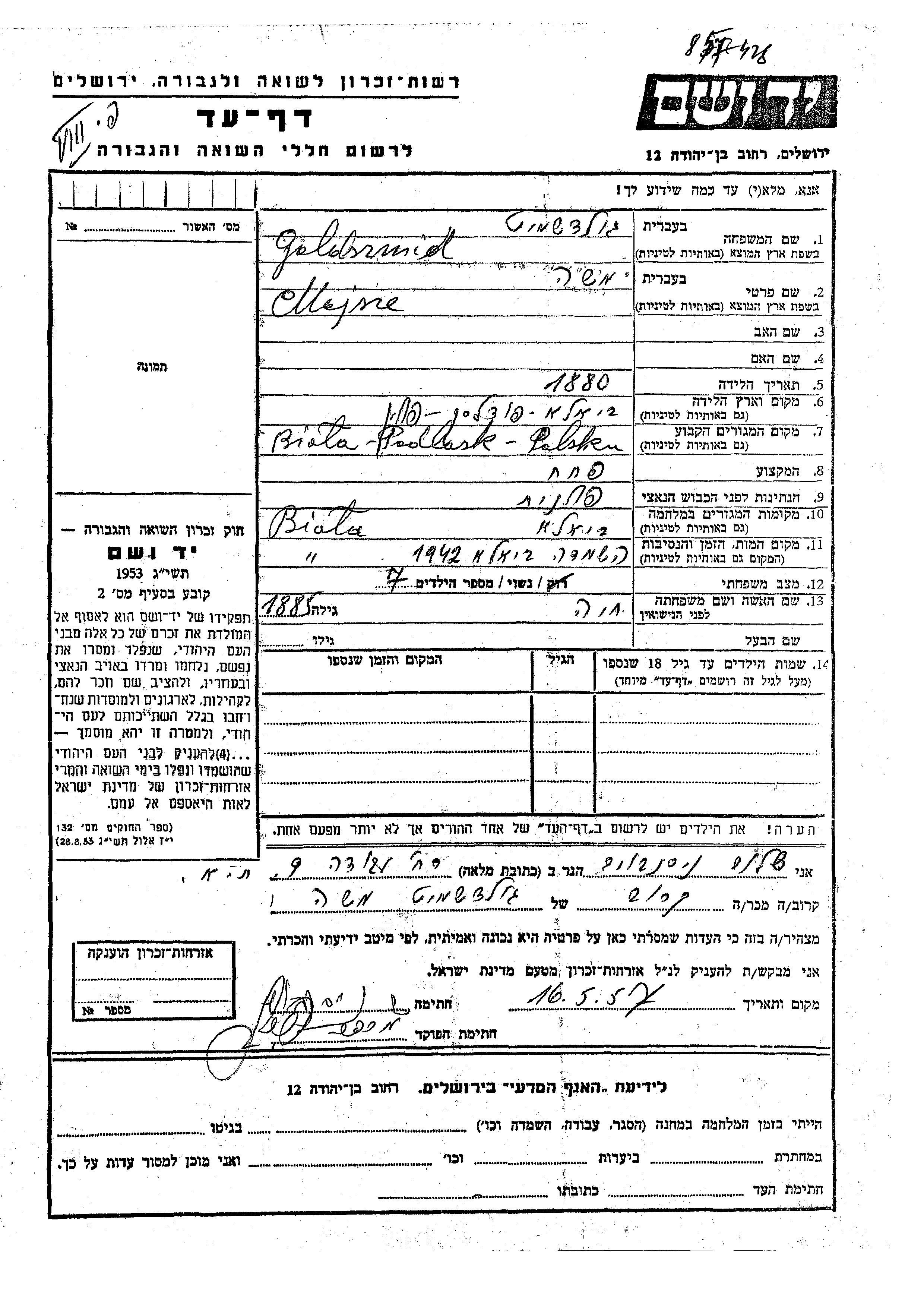 Мойше Миша Гольдшмид, место рождения: Бяла-Подляска, Польша. Жестянщик. Женат / замужем. Место жительства до войны: Бяла-Подляска, Польша. Место во время войны: Бяла-Подляска, Польша.