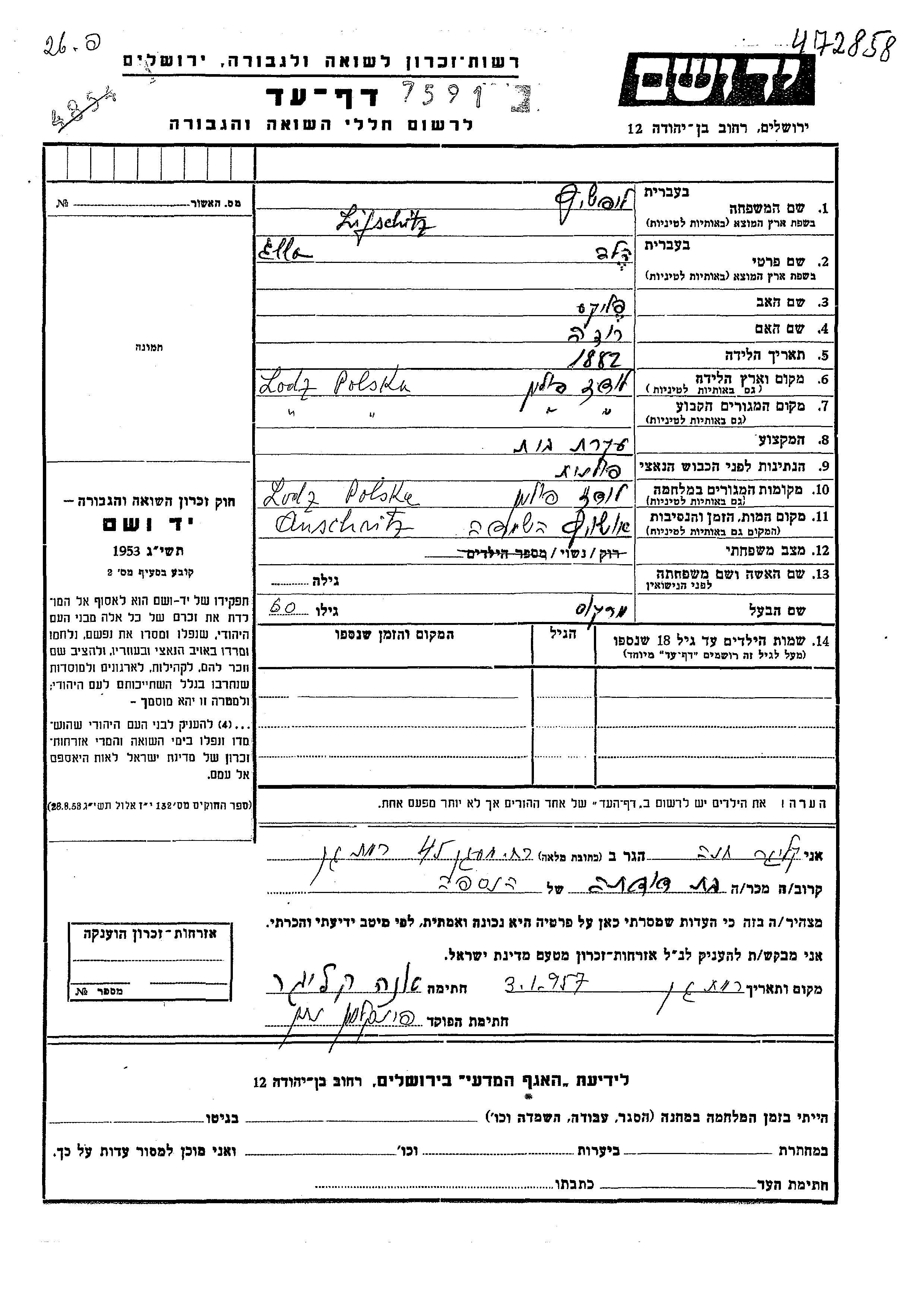 Элла Хела Лифшиц, место рождения: Лодзь, Польша. Отец: Феликс, mать:Роза. Домохозяйка. Женат / замужем. Место жительства до войны: Лодзь, Польша. Место во время войны: Лодзь, Польша.