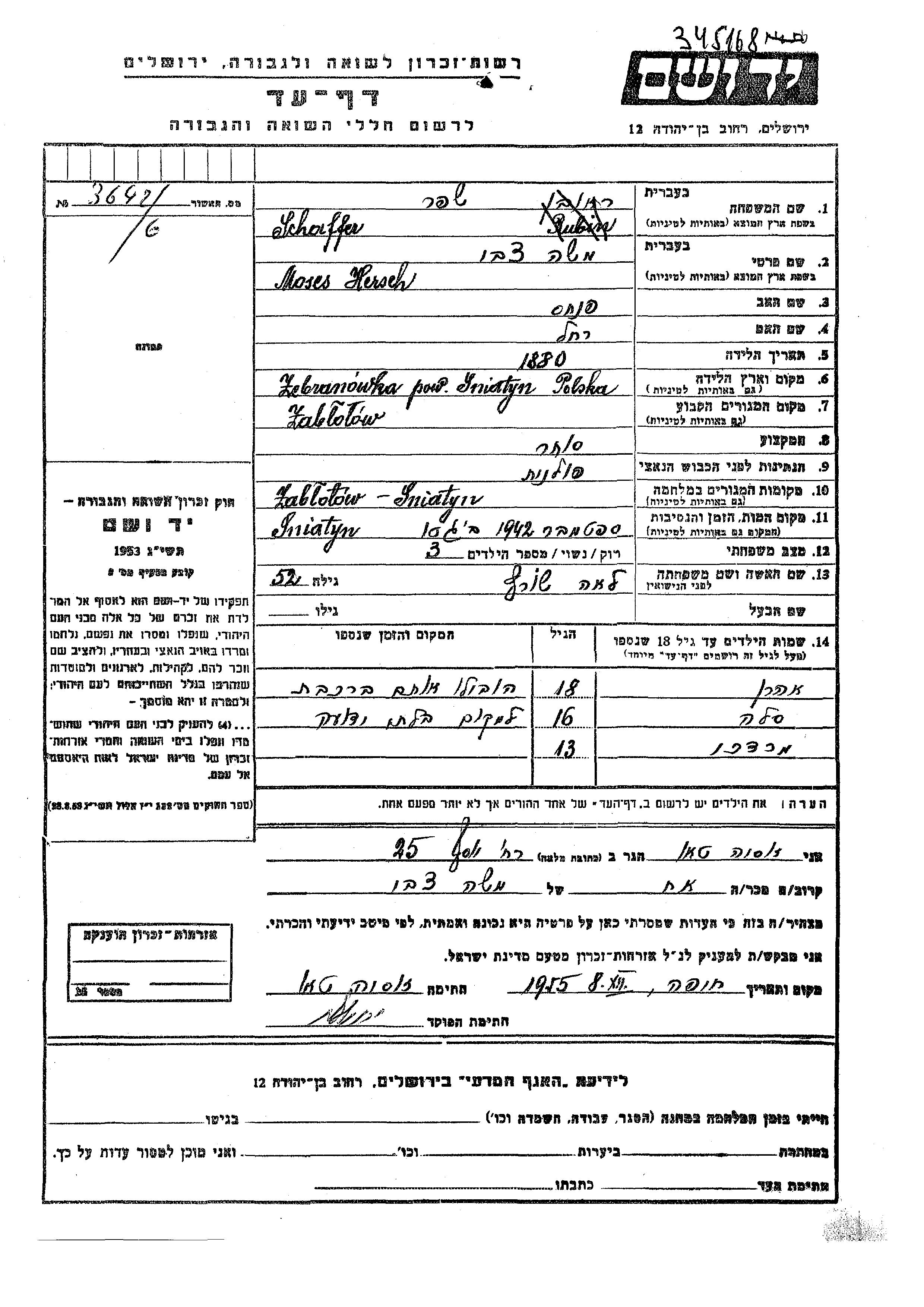 Мозес Герш Цви Шаффер, место рождения: Зибрановка, Польша. Отец: Пинхас, mать:Рахель. Торговец / торговка. Женат / замужем. Место жительства до войны: Заболотов, Польша. Место во время войны: Заболотов, Польша.