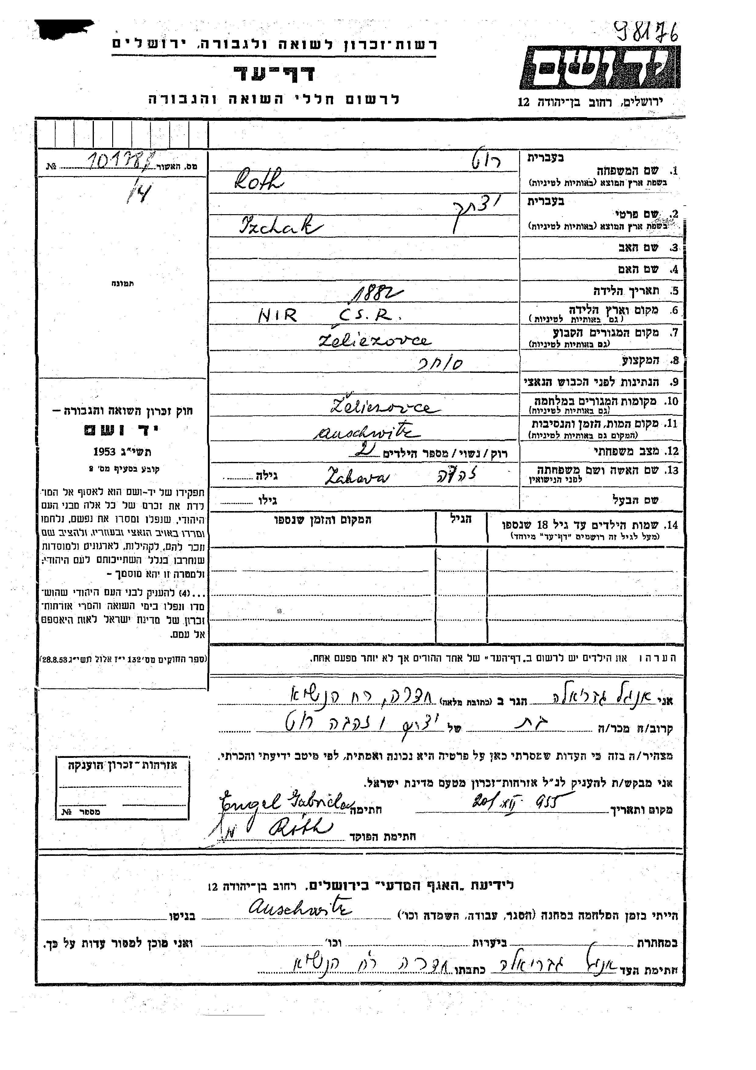 Рот Рут Ицхак 1882 Жельезовце, Чехословакия Лист свидетельских показаний