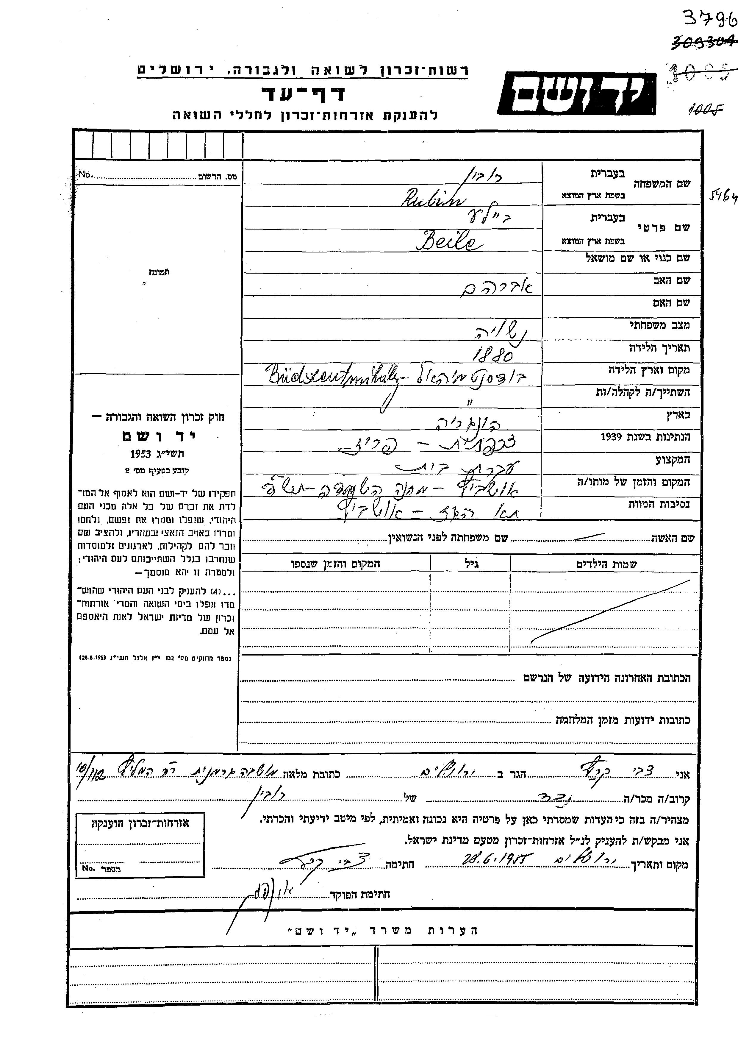 Бейле Рубин, место рождения: Будсентмихай, Венгрия. Отец: Авраам. Домохозяйка. Женат / замужем. Место жительства до войны: Будсентмихай, Венгрия.
