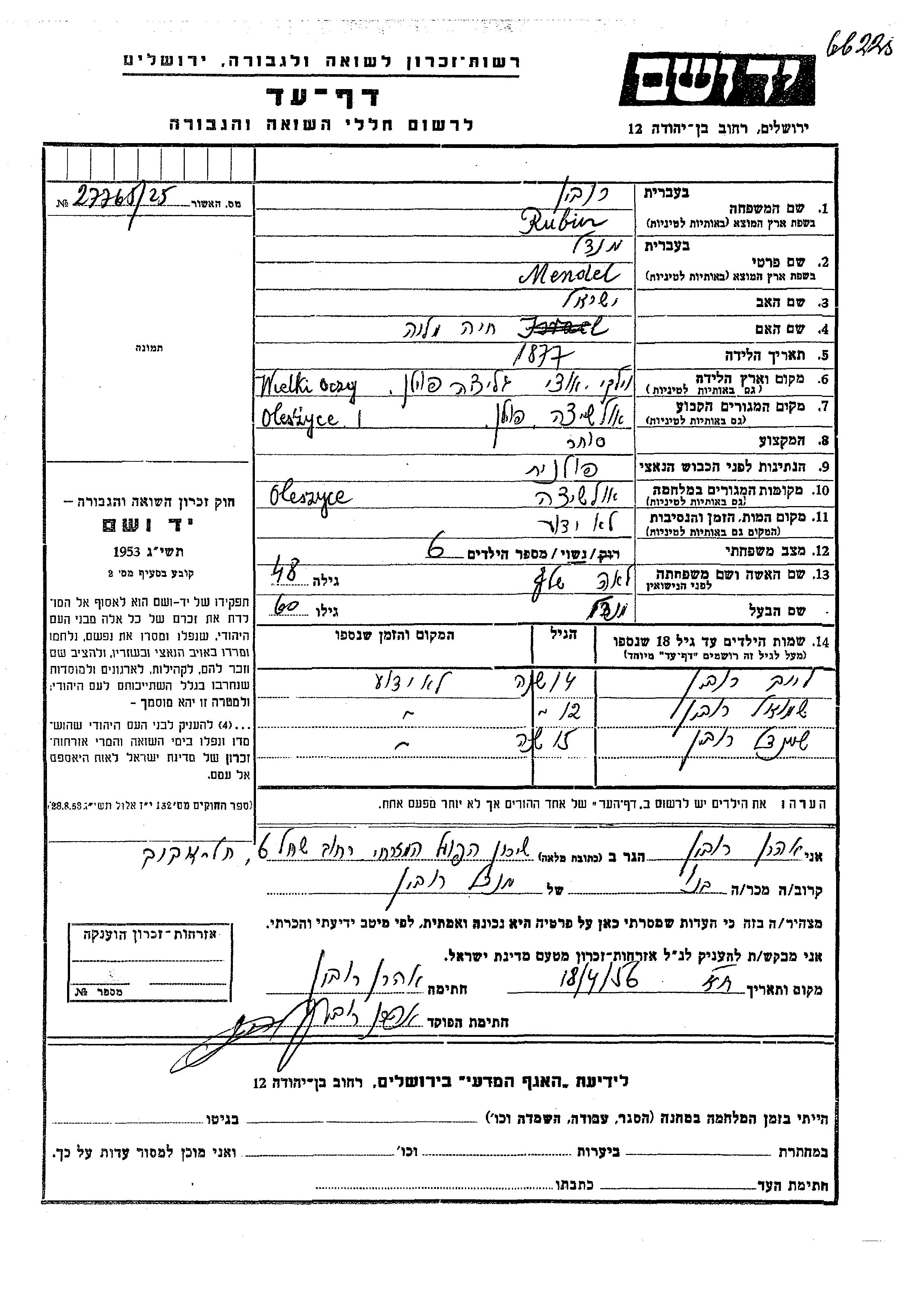 Мендель Рубин, место рождения: Вельке-Очи, Польша. Отец: Исраэль, mать:Хая Малка. Торговец / торговка. Женат / замужем. Место жительства до войны: Олешице, Польша. Место во время войны: Олешице, Польша.
