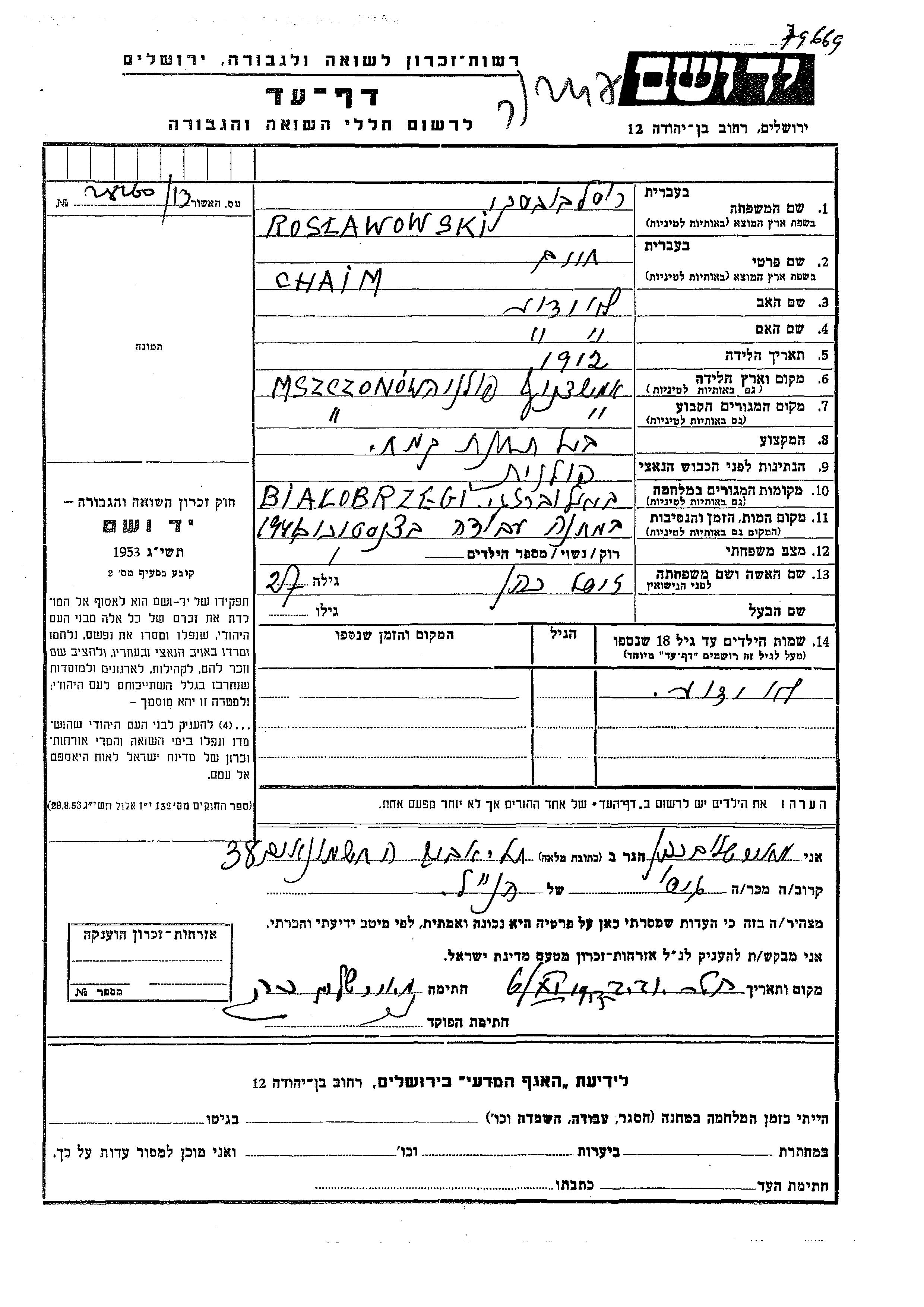 Рославовски Хаим 1912 Мщонув, Польша Лист свидетельских показаний