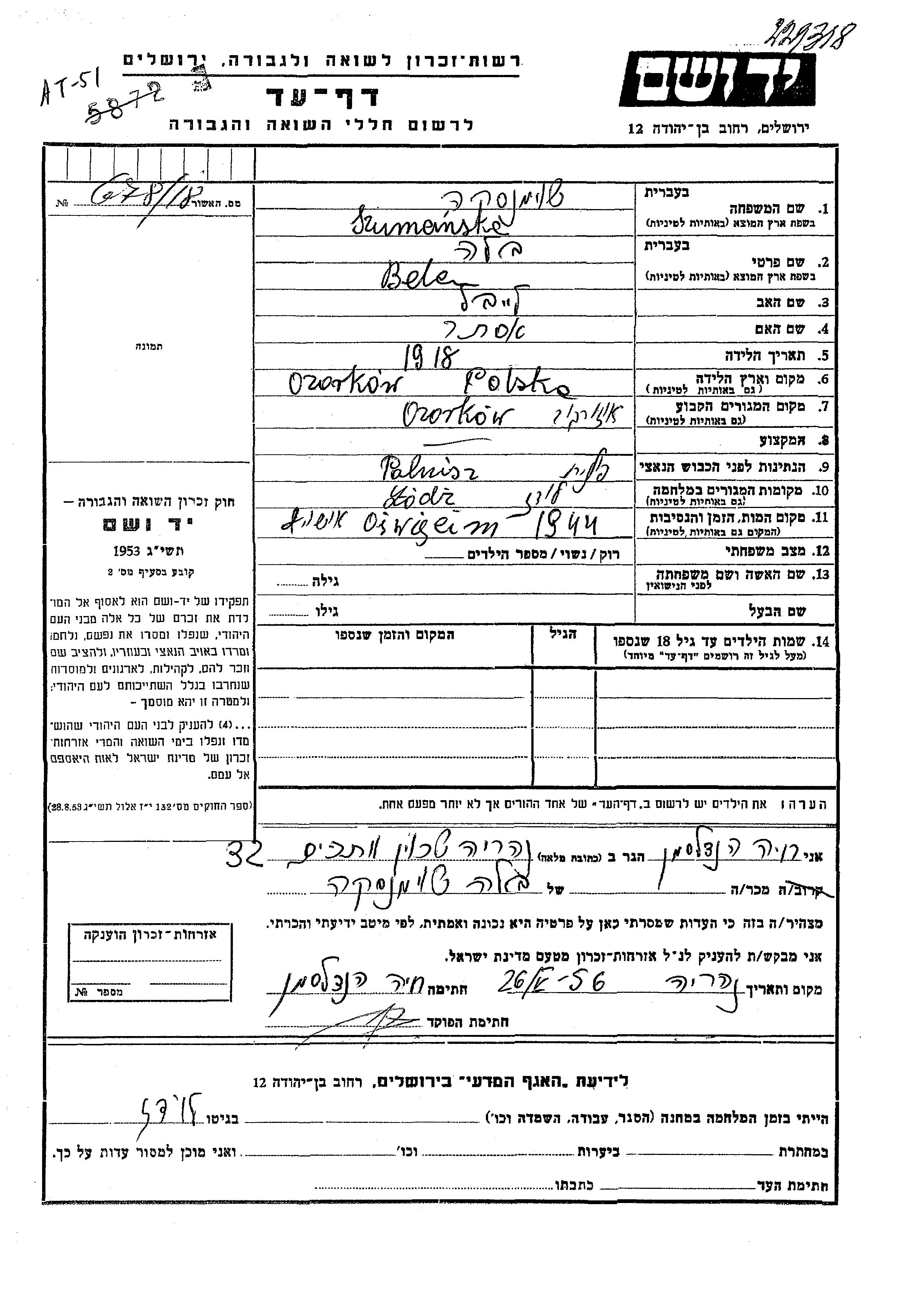 Бела Шуманске, место рождения: Озаркув, Польша. Отец: Лейбел, mать:Эстер. Место жительства до войны: Озаркув, Польша. Место во время войны: Лодзь, Польша.