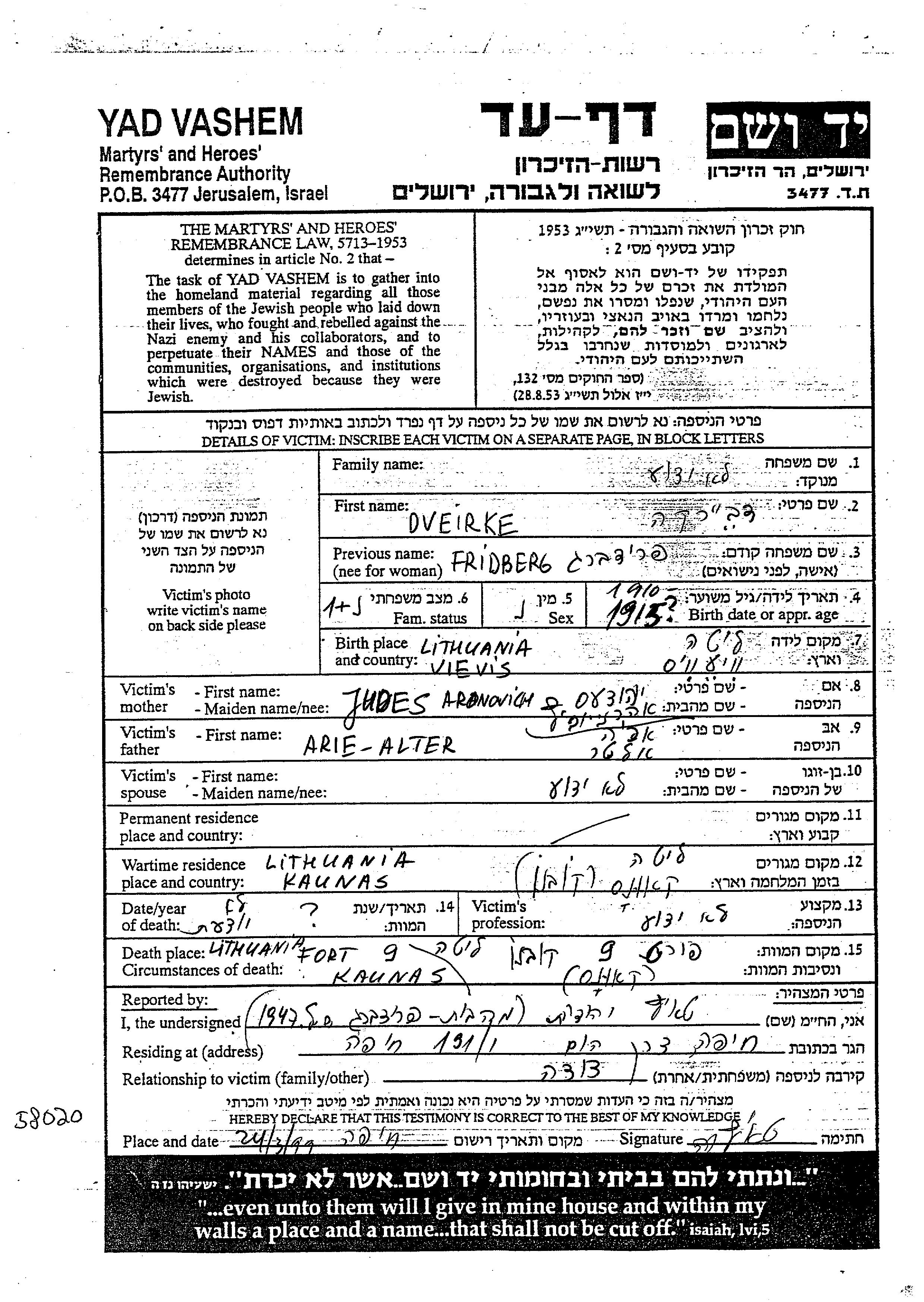 Двеирке Фамилия неизвестна, девичья фамилия Фридберг, место рождения: Виевис, Литва. Отец: Арье Алтер, mать:Юдес. Женат / замужем. Место во время войны: Каунас, Литва.