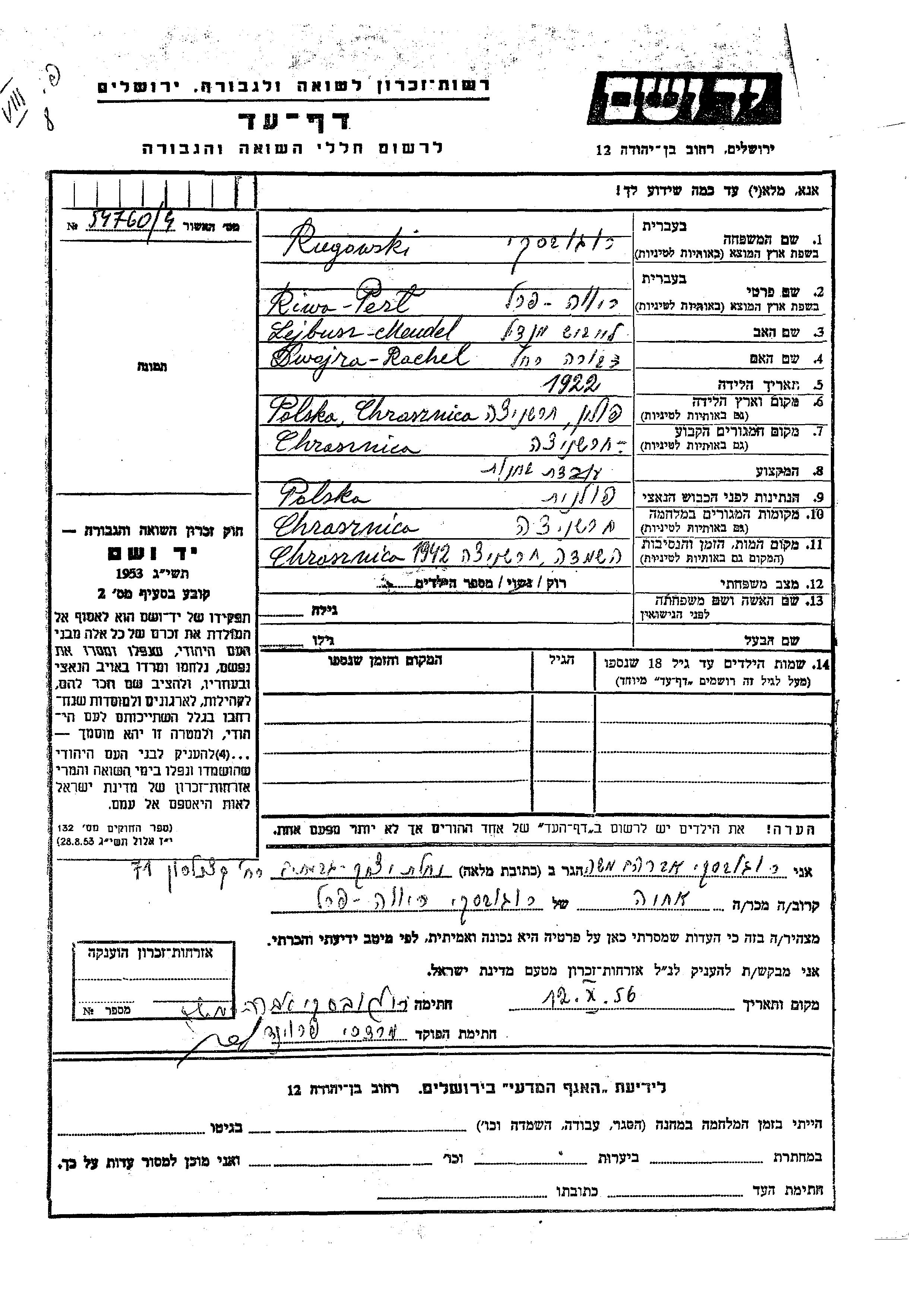 Рива Перл Руговски, место рождения: Харшница, Польша. Отец: Лейбуш Мендель Мендил, mать:Двойра Рахель. Работница магазина. Холост / не замужем. Место жительства до войны: Харшница, Польша. Место во время войны: Харшница, Польша.