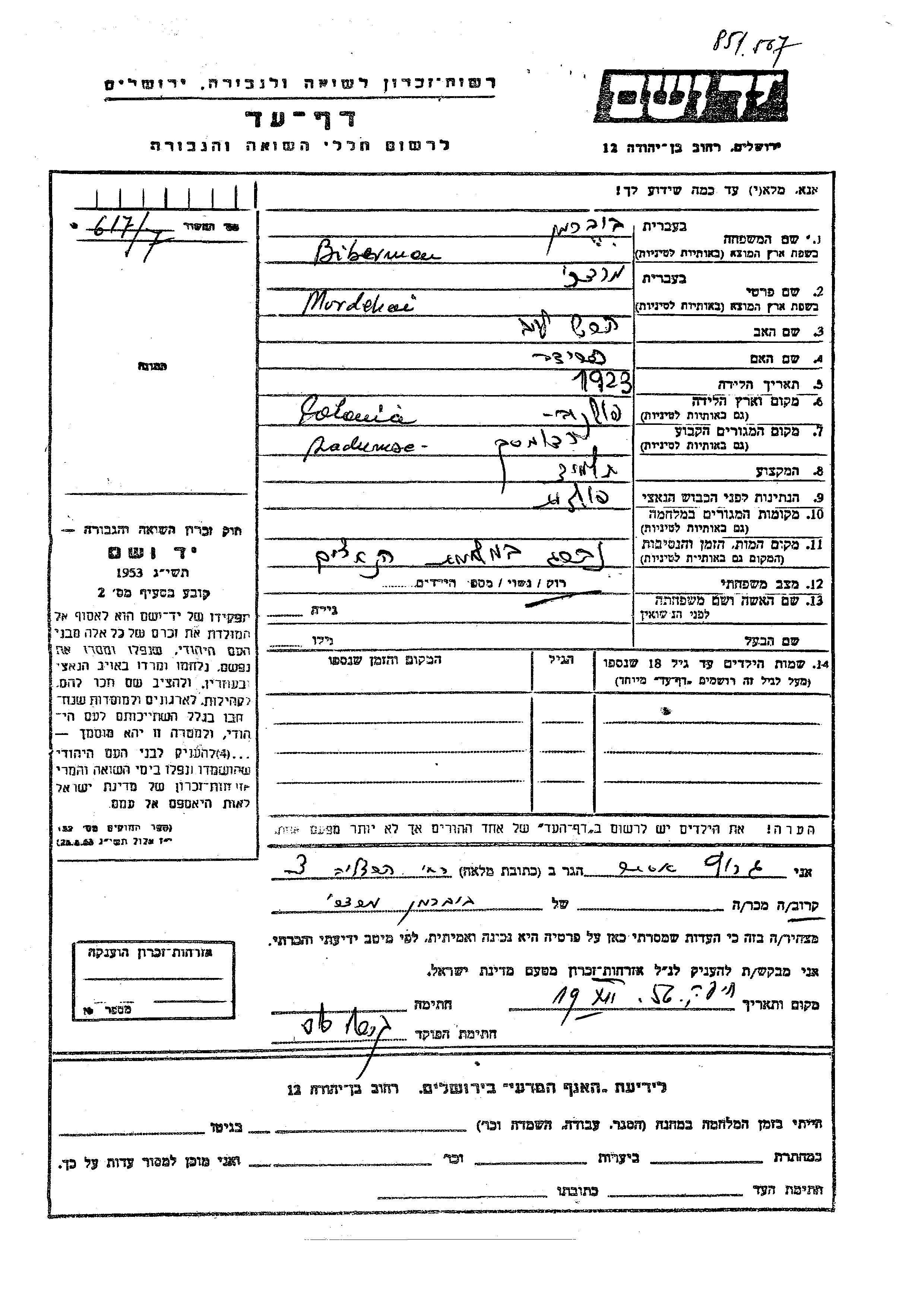 Мордехай Биберман, место рождения: Польша. Отец: Герш Лейб, mать:Фрида. Ученик / ученица. Холост / не замужем. Место жительства до войны: Радомско, Польша.