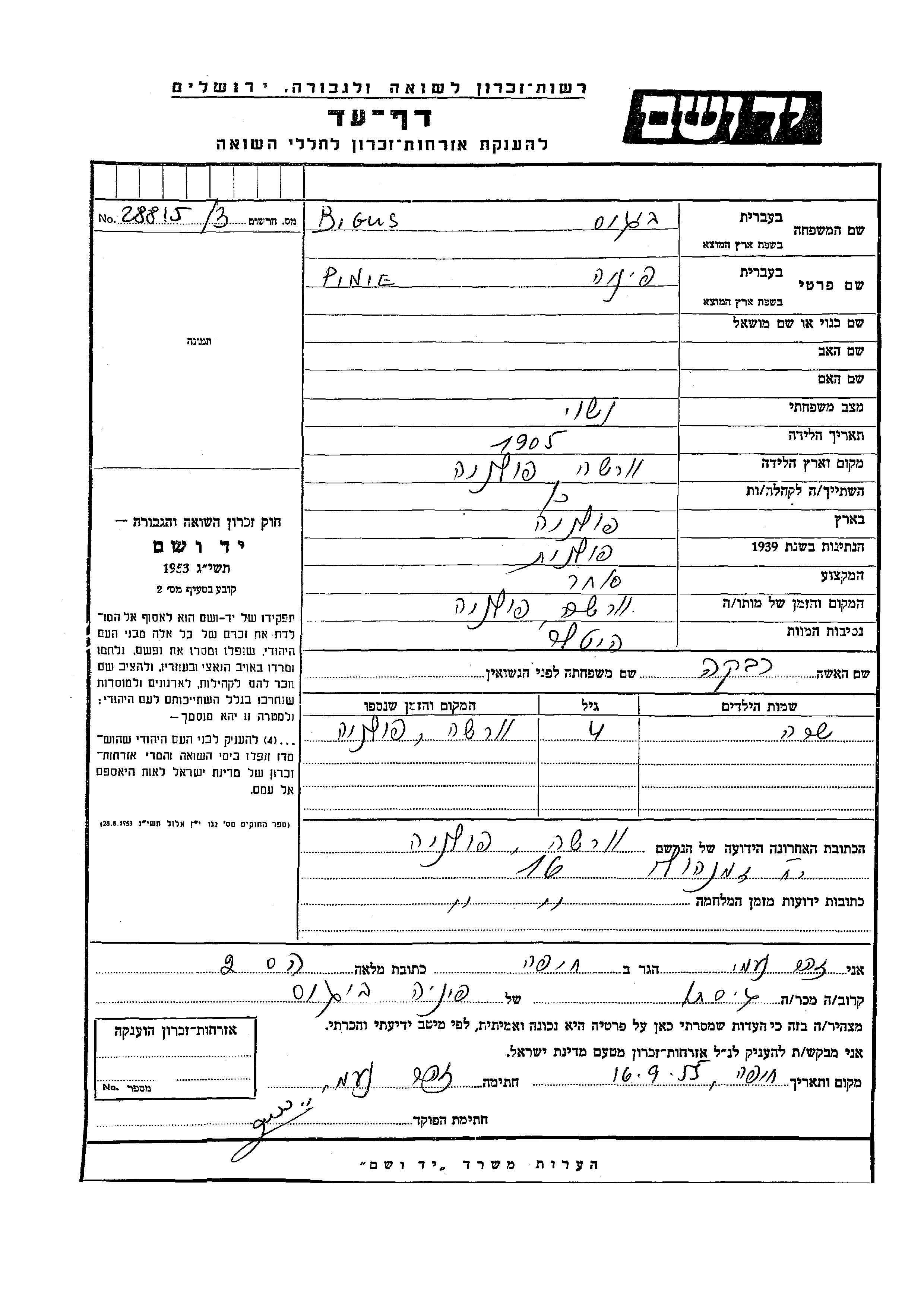Пине Пиня Бигус, место рождения: Варшава, Польша. Торговец / торговка. Женат / замужем. Место жительства до войны: Польша. Место во время войны: Варшава, Польша.