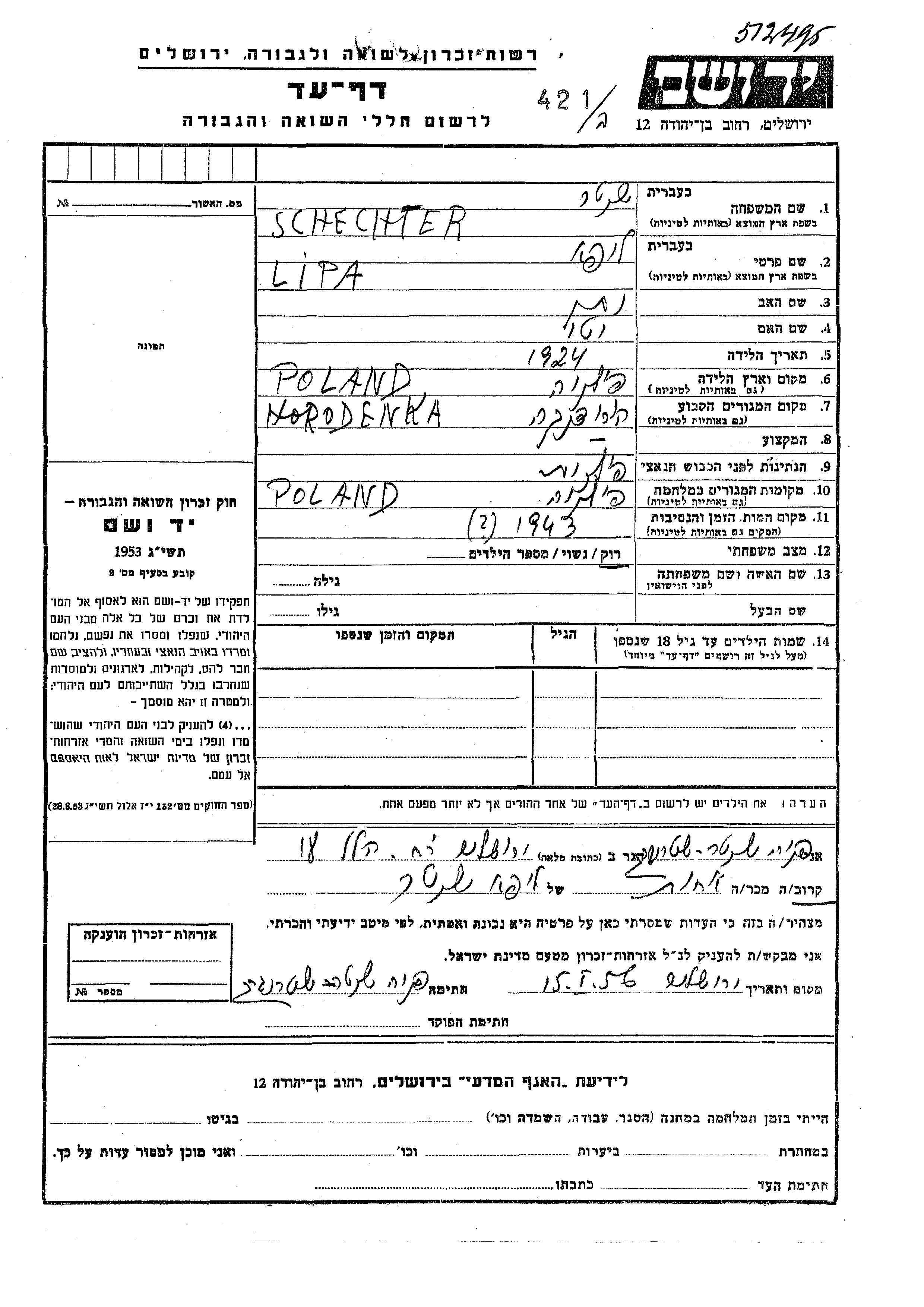 Липа Шехтер, место рождения: Польша. Отец: Натан, mать:Ети. Холост / не замужем. Место жительства до войны: Городенка, Польша. Место во время войны: Польша.