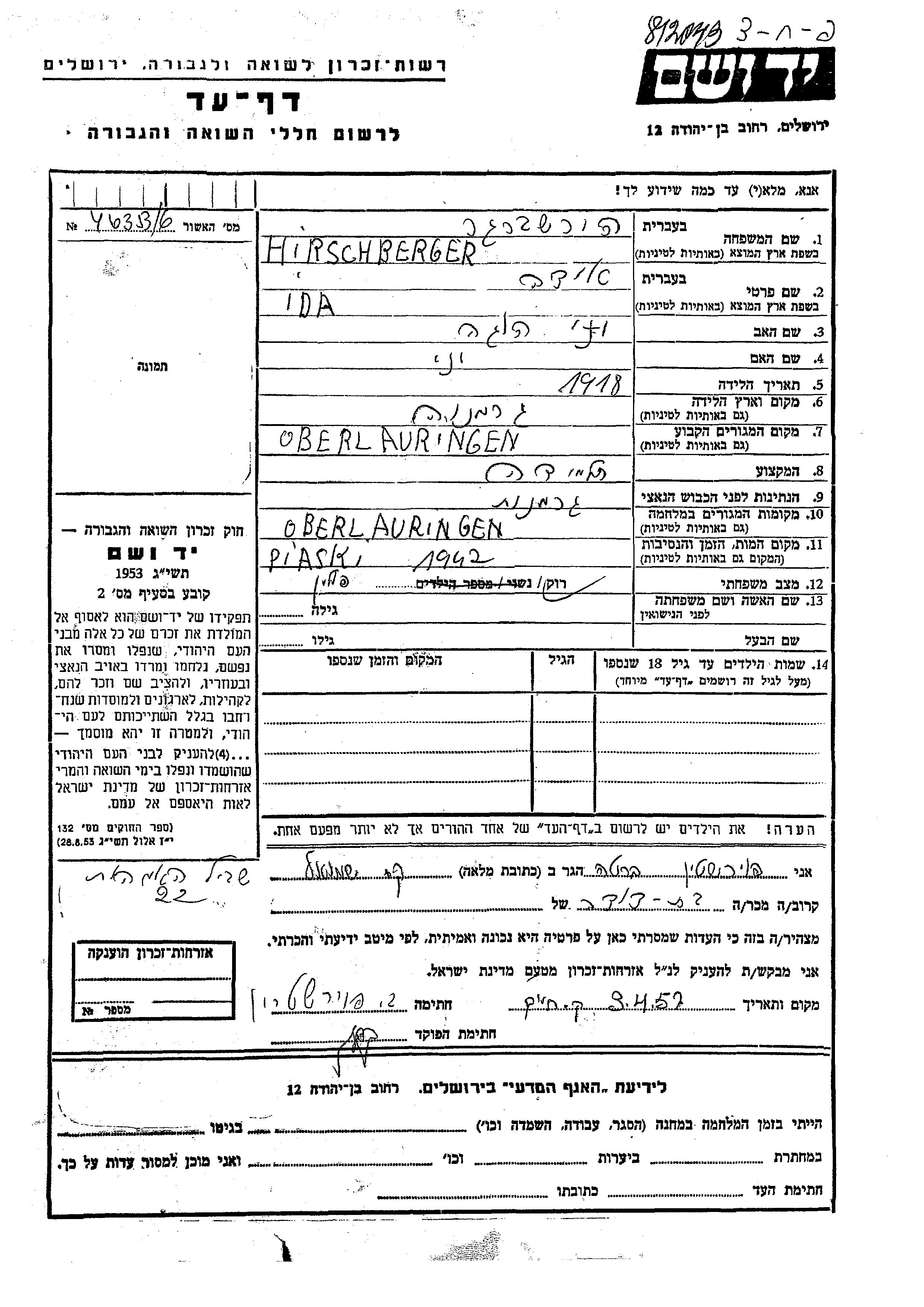Ида Хиршбергер, место рождения: Германия. Отец: Хога, mать:Йени. Ученик / ученица. Холост / не замужем. Место жительства до войны: Оберлауринген, Германия. Место во время войны: Оберлауринген, Германия.