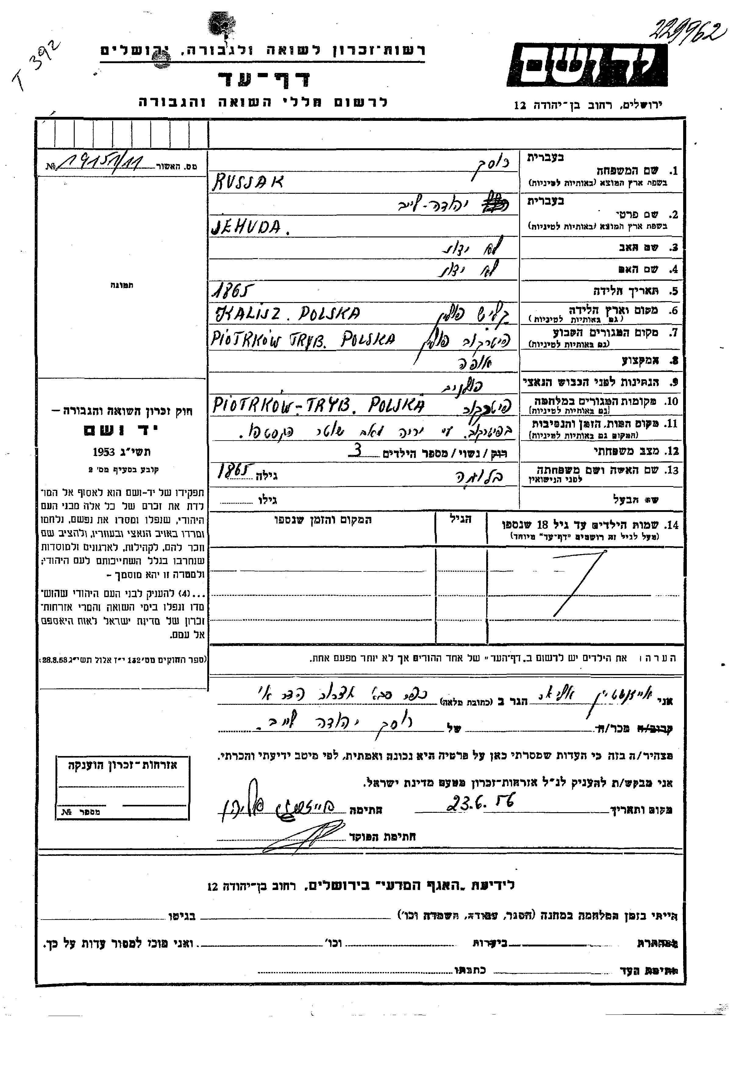 Руссак Иегуда Лейб 1865 Пётркув-Трыбунальски, Польша Лист свидетельских показаний