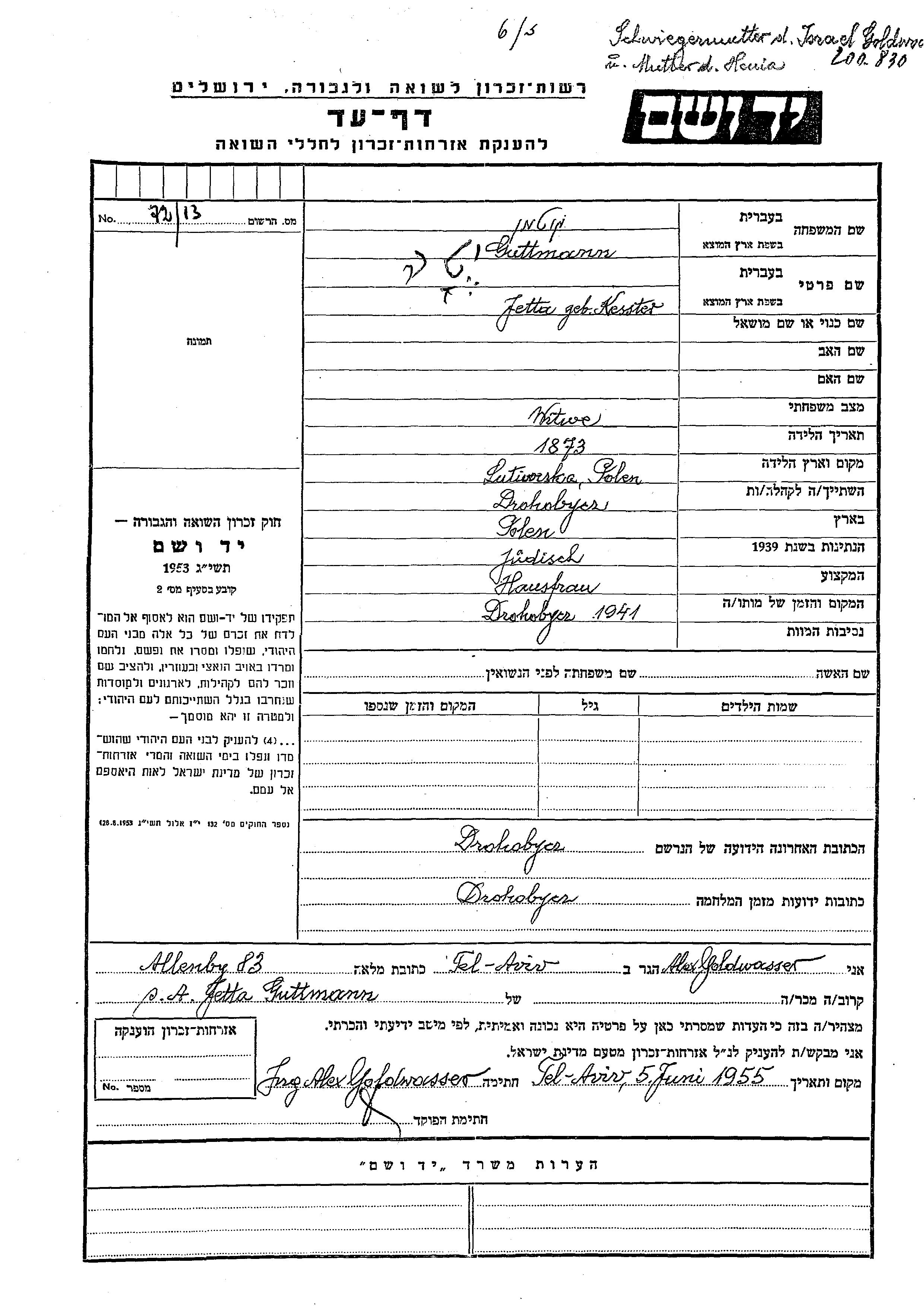 Етта Ета Гуттманн, девичья фамилия Кесстер, место рождения: Лютовиска, Польша. Домохозяйка. Вдова. Место жительства до войны: Дрогобыч, Польша. Место во время войны: Дрогобыч, Польша.