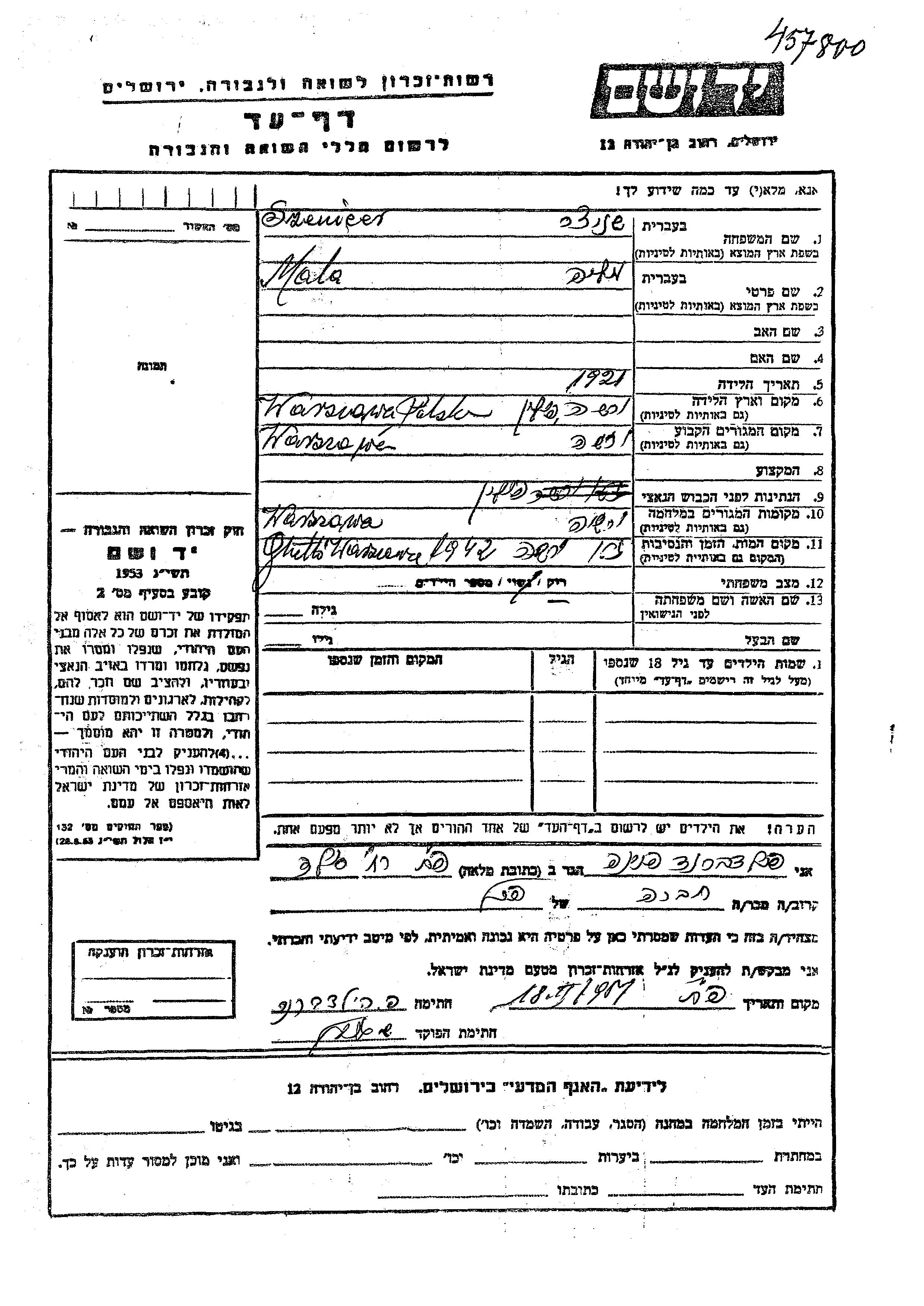 Шеницер Шницер Мала 1921 Варшава, Польша Лист свидетельских показаний