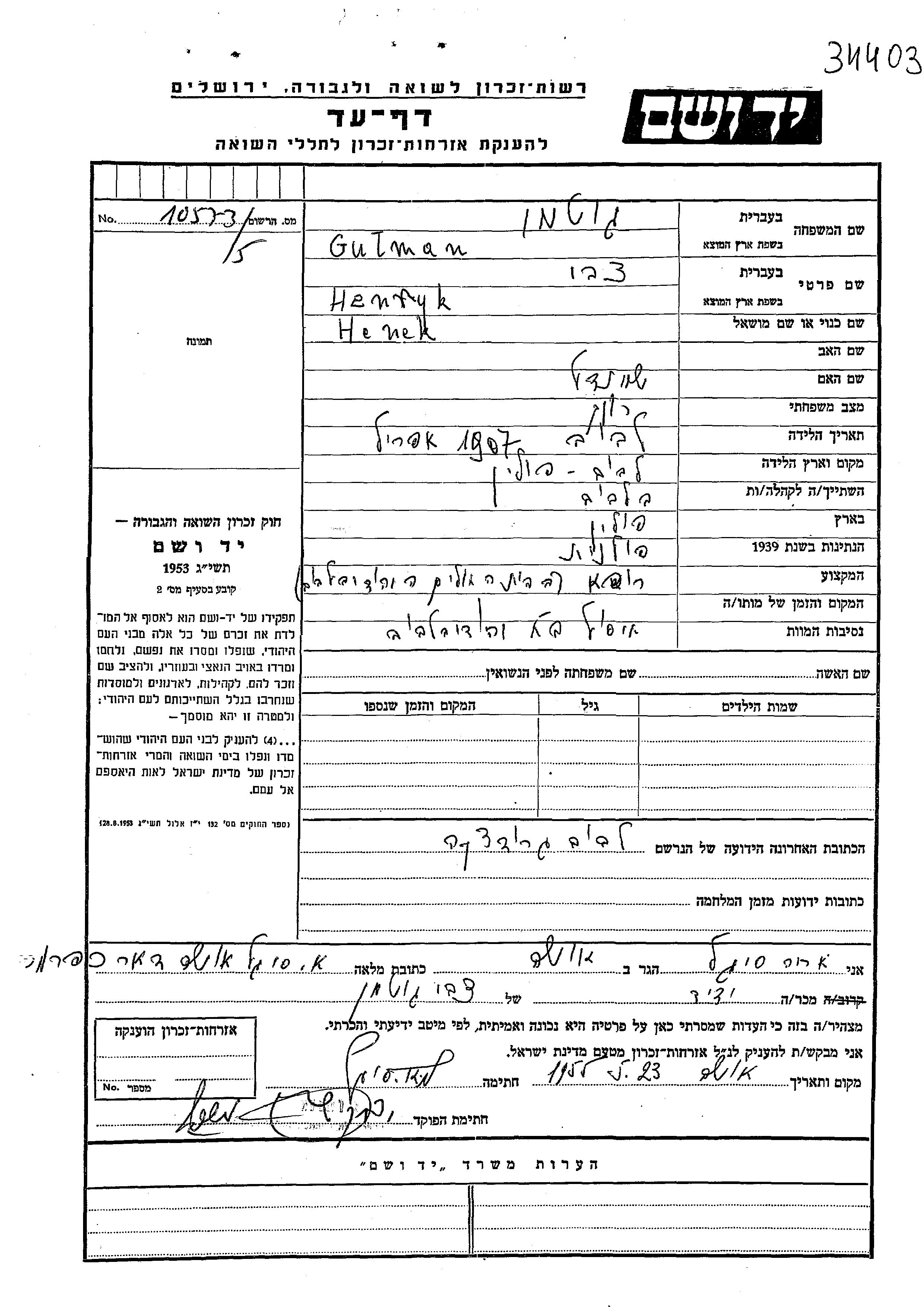 Хенрик Цви Гутман, место рождения: Львов, Польша.Mать:Шейндель. Врач. Холост / не замужем. Место жительства до войны: Львов, Польша. Место во время войны: Львов, Польша.