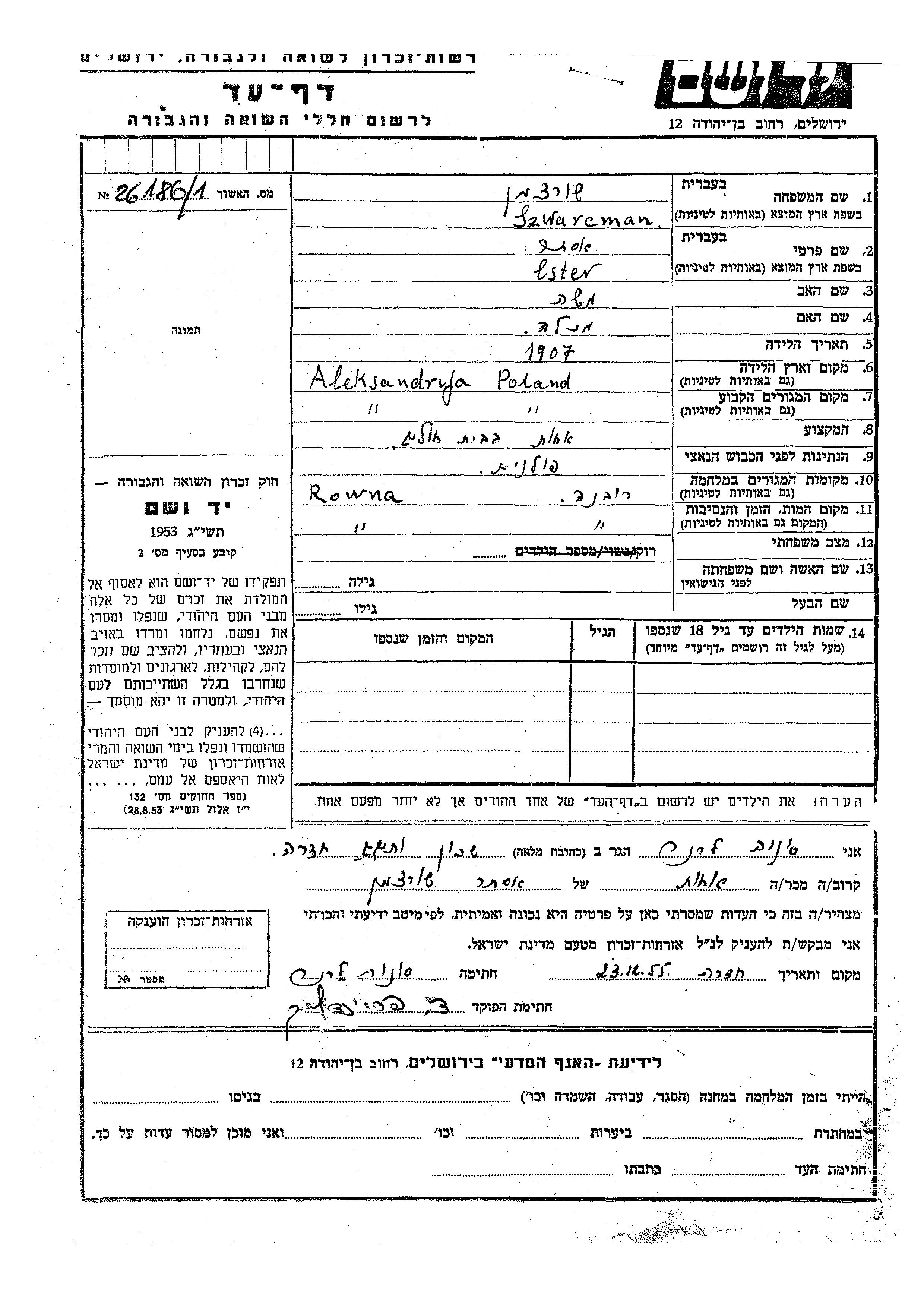 Эстер Шварцман, место рождения: Александрия, Польша. Отец: Моше, mать:Махла. Медбрат / медсестра. Холост / не замужем. Место жительства до войны: Александрия, Польша. Место во время войны: Ровна, Польша.