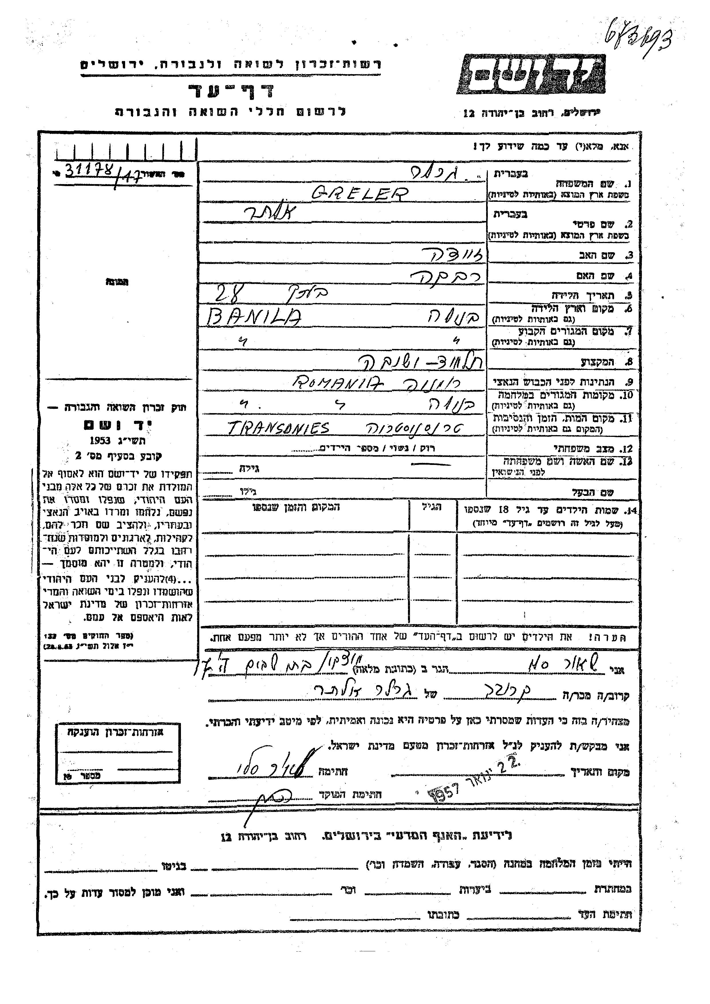 Алтер Грелер Герлер, место рождения: Банила, Румыния. Отец: Зейде, mать:Ривка. Учащийся иешивы. Место жительства до войны: Банила, Румыния. Место во время войны: Банила, Румыния.
