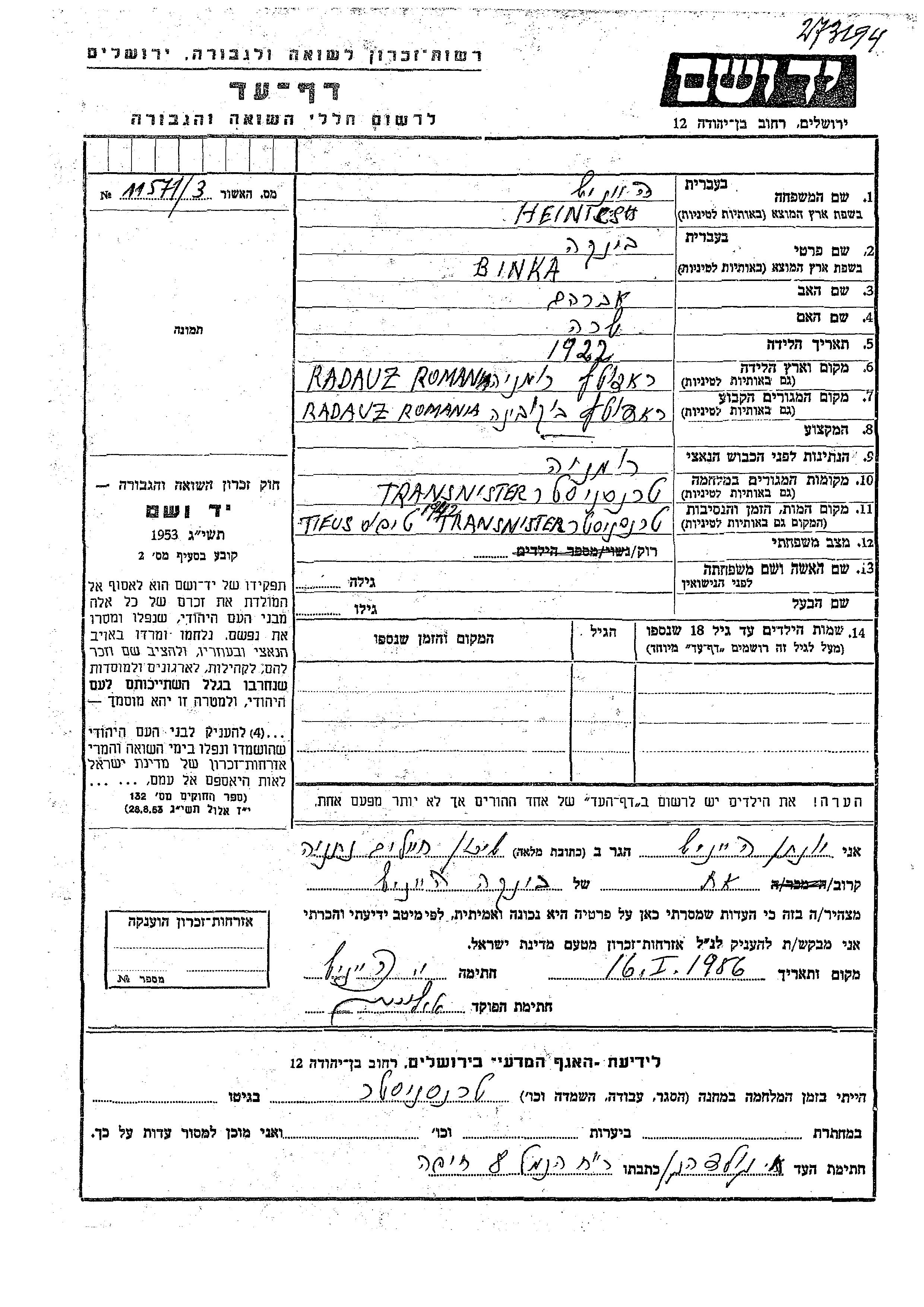 Хайниш Бинка 1922 Радауц, Румыния Лист свидетельских показаний