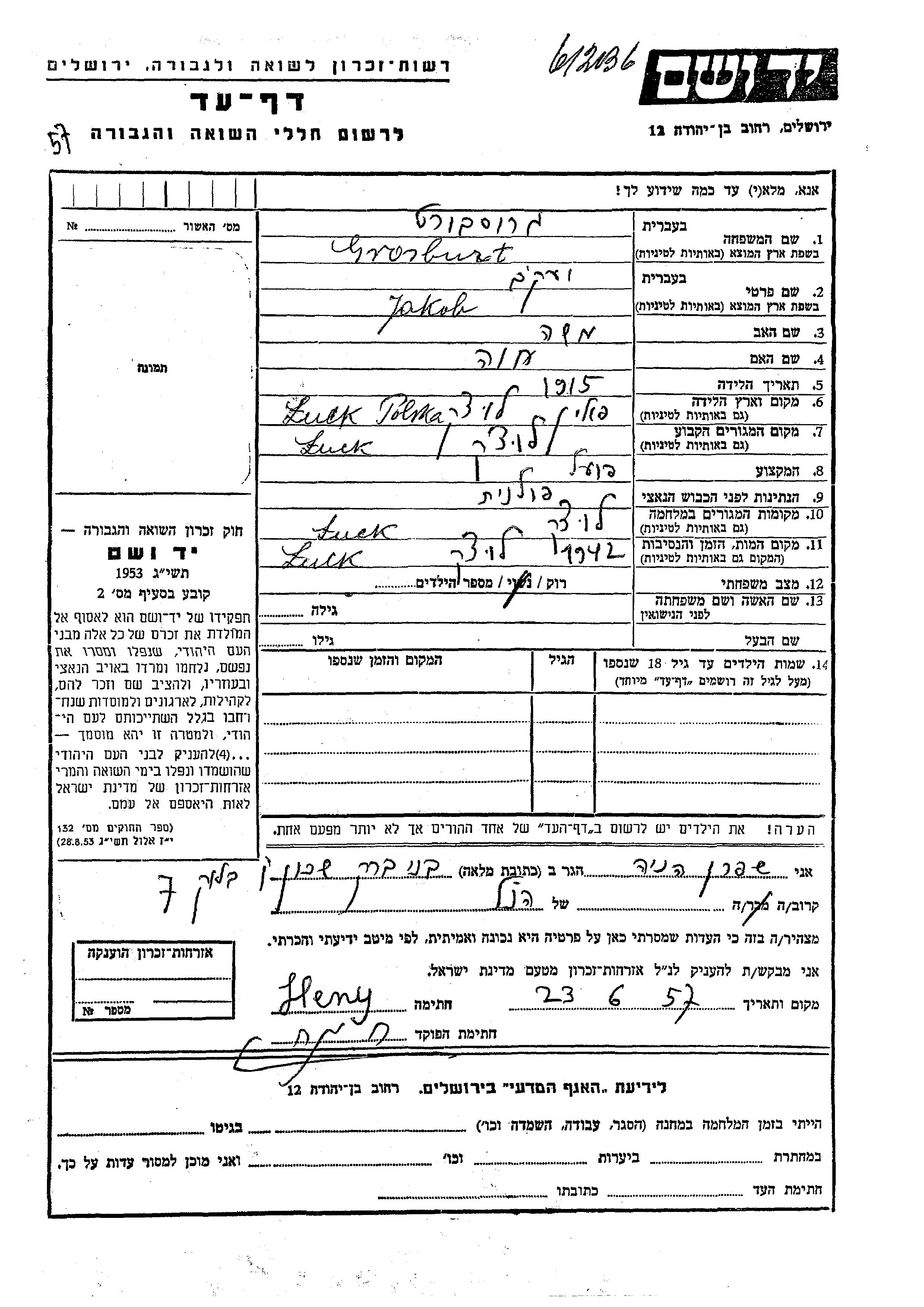 Якоб Гросбурт, место рождения: Лоцк, Польша. Отец: Моше, mать:Хава. Рабочий / рабочая. Холост / не замужем. Место жительства до войны: Лоцк, Польша. Место во время войны: Лоцк, Польша.