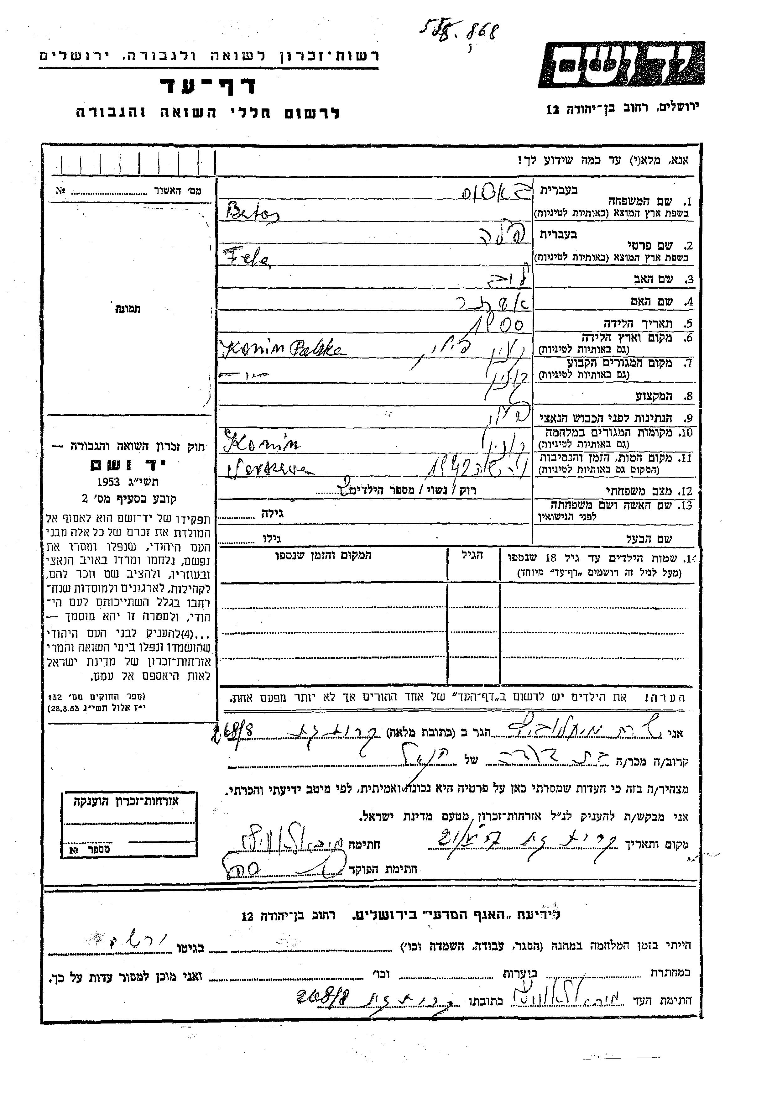 Фела Батос, место рождения: Конин, Польша. Отец: Лейб, mать:Эстер. Женат / замужем. Место жительства до войны: Конин, Польша. Место во время войны: Конин, Польша.