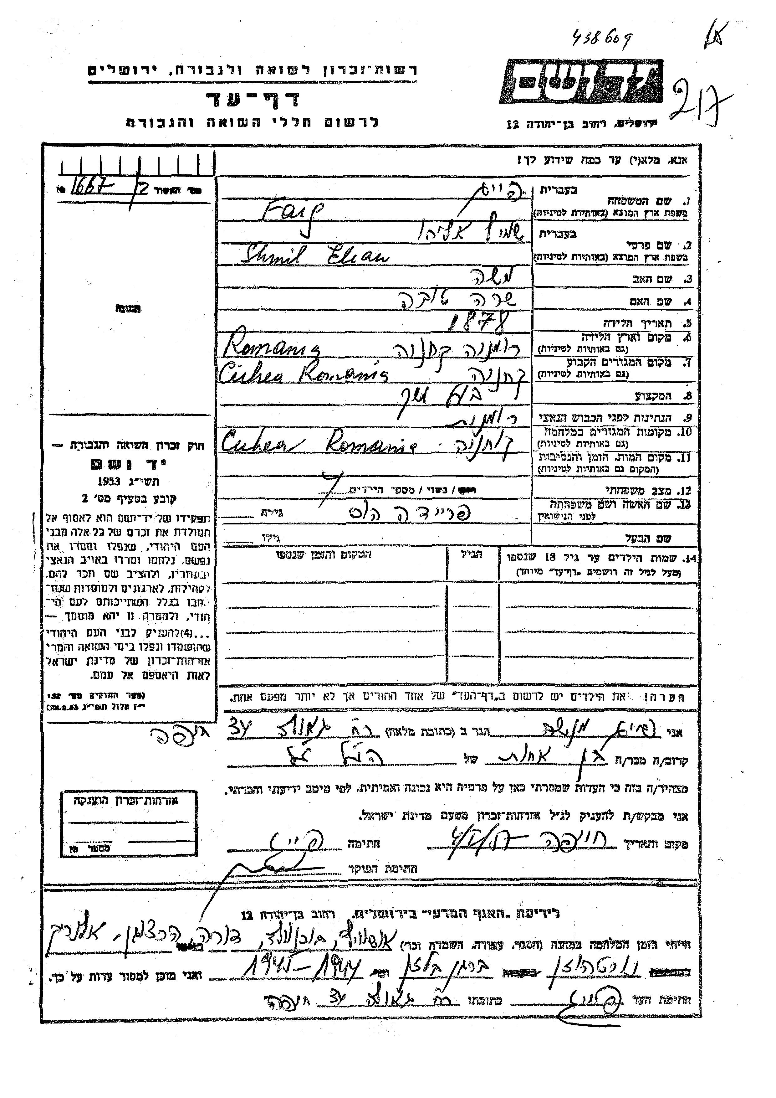 Файг Шмиль Элиау 1878 Кухя, Румыния Лист свидетельских показаний