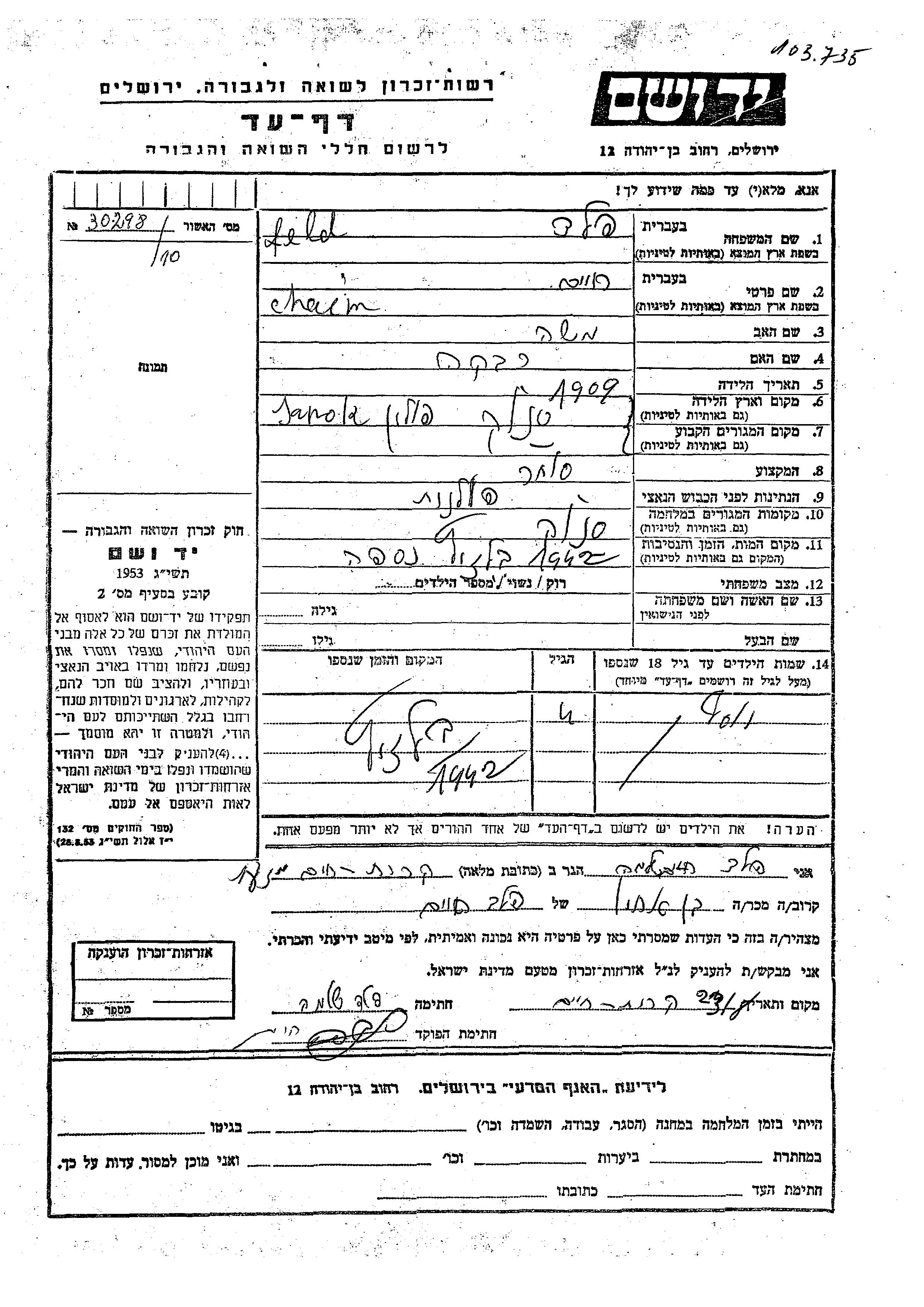 Фельд Хаим 1909 Санок, Польша Лист свидетельских показаний