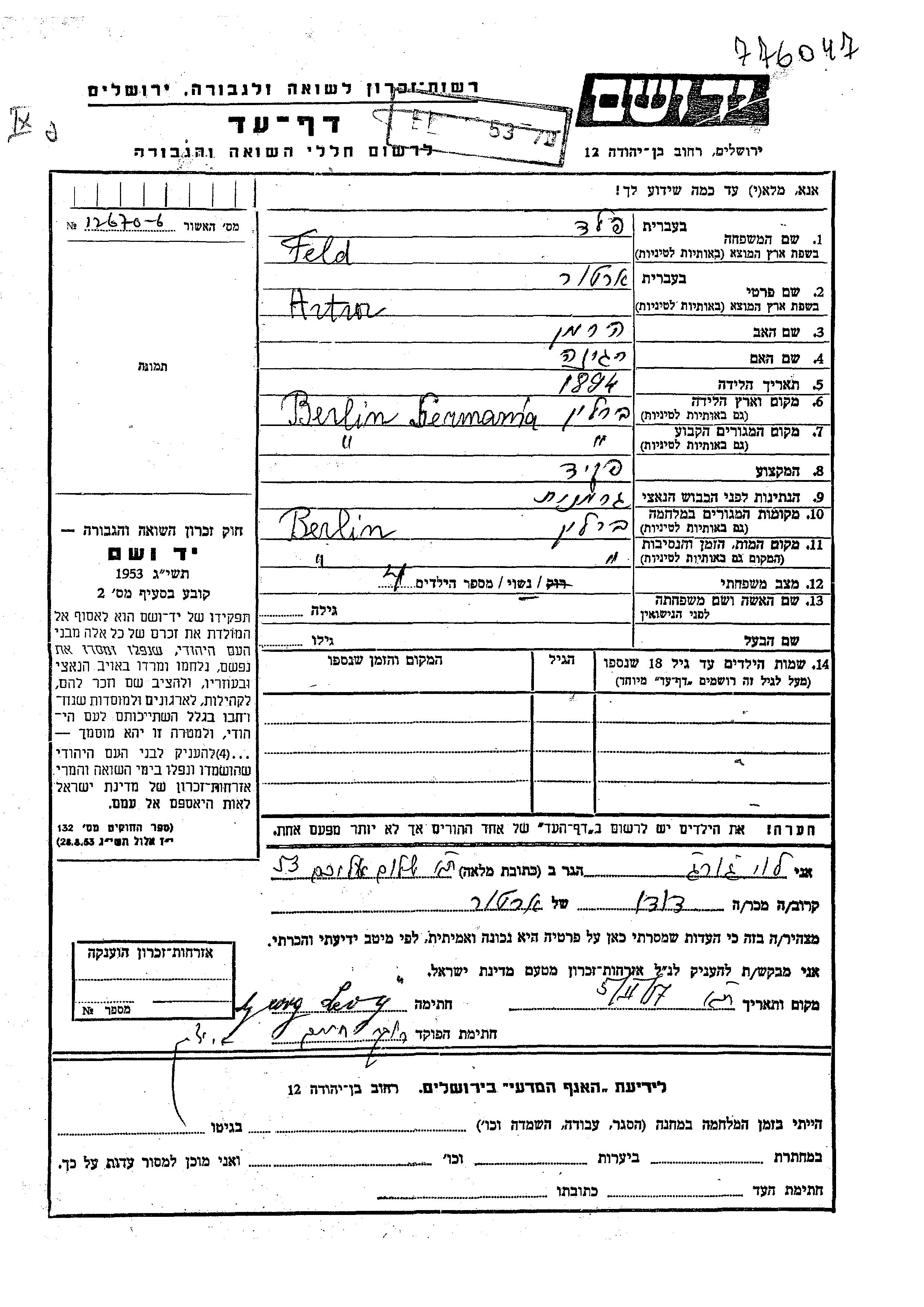 Артур Фельд, место рождения: Берлин, Германия. Отец: Херман, mать:Регина. Клерк. Женат / замужем. Место жительства до войны: Берлин, Германия. Место во время войны: Берлин, Германия.