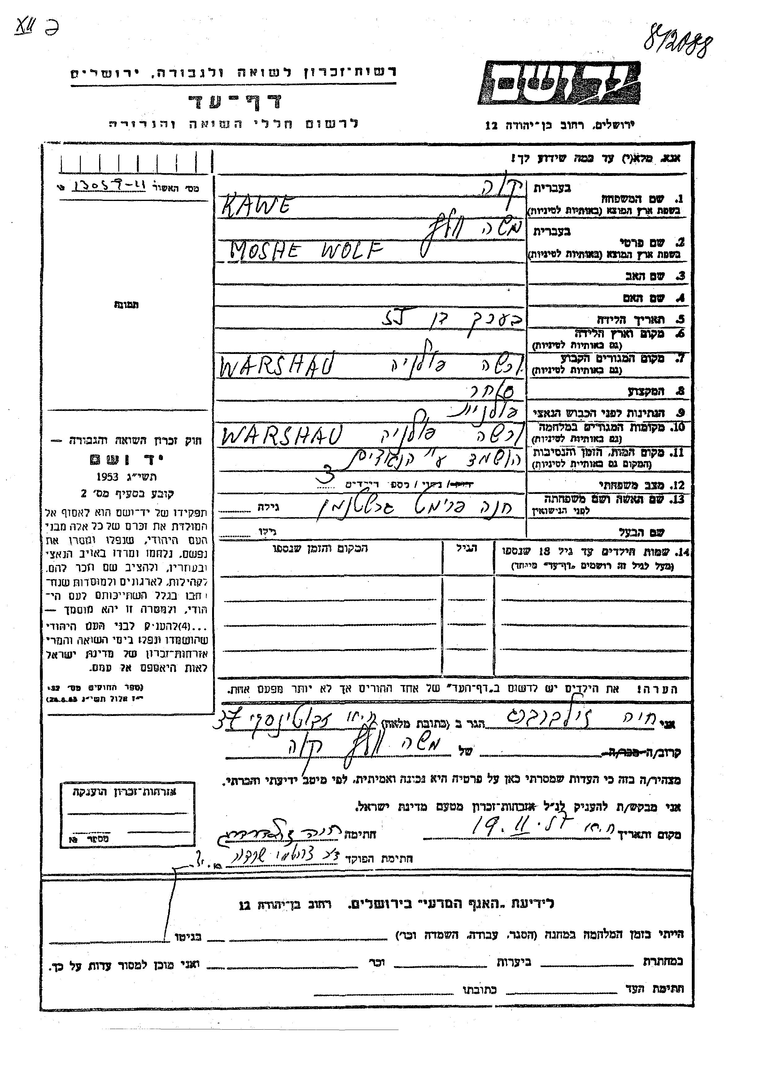 Каве Вольф Моше Варшава, Польша Лист свидетельских показаний