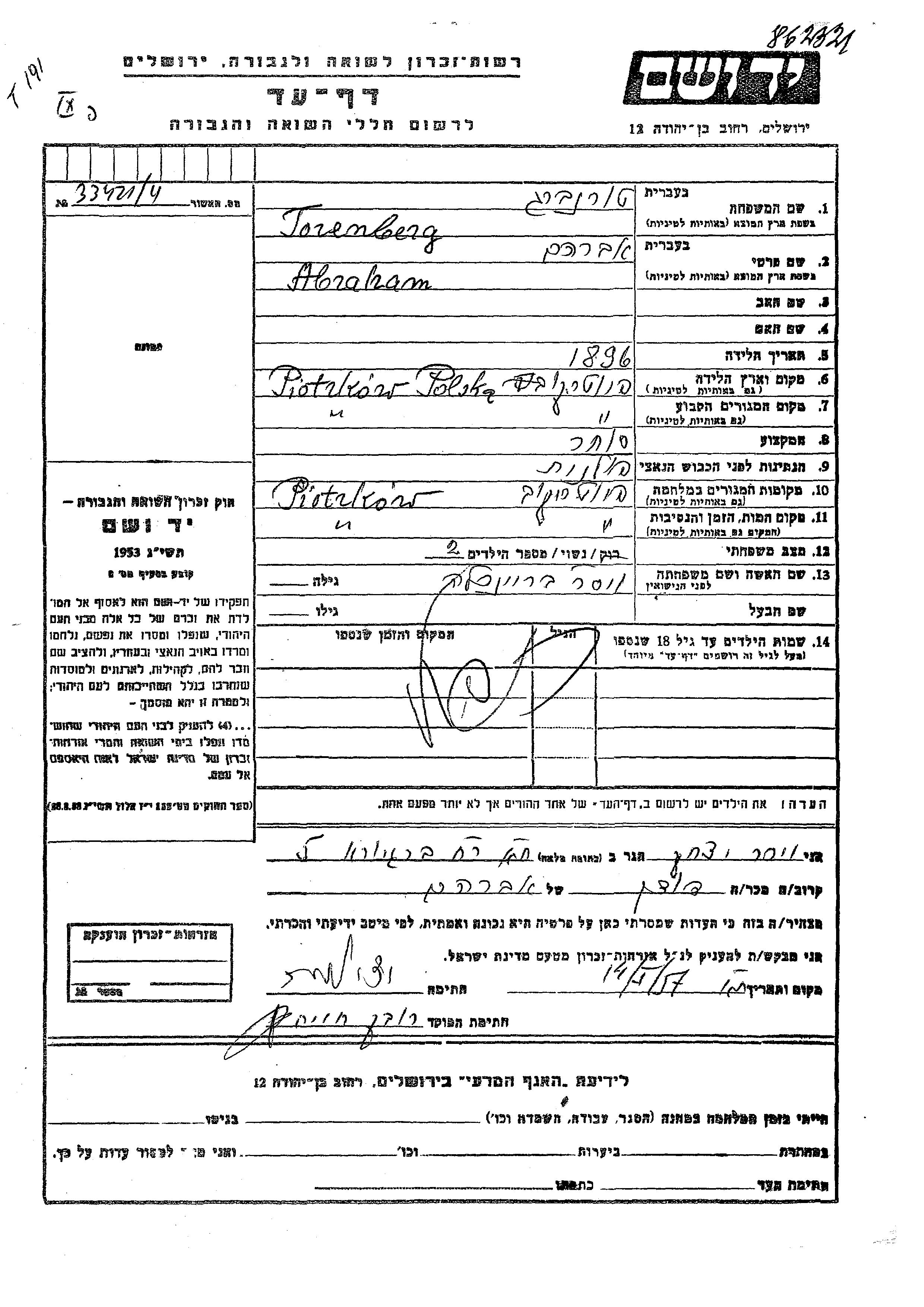 Абраам Торенберг, место рождения: Пётркув, Польша. Торговец / торговка. Женат / замужем. Место жительства до войны: Пётркув, Польша. Место во время войны: Пётркув, Польша.