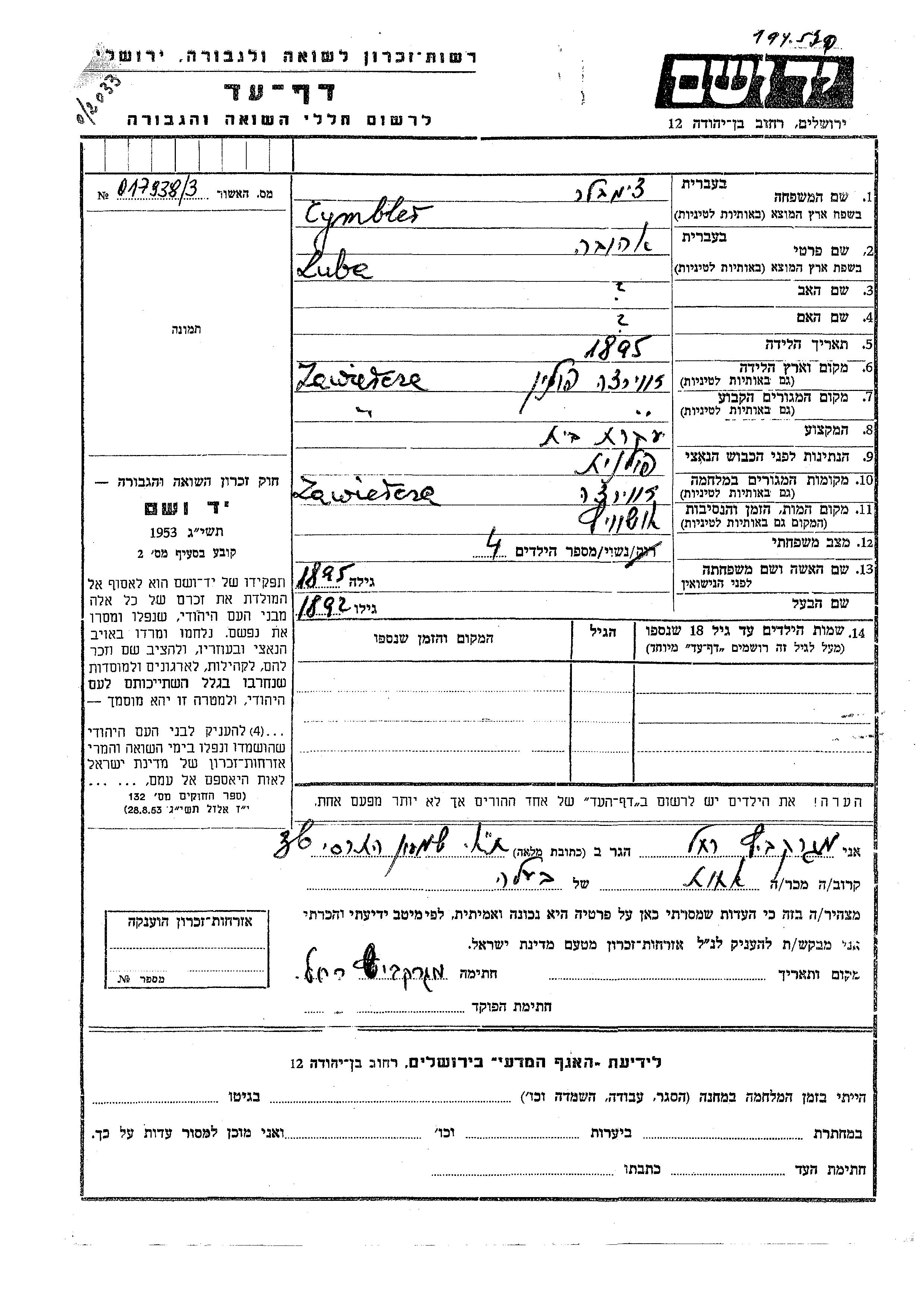 Цымблер Люба Ахува 1895 Zawiercze, Польша Лист свидетельских показаний