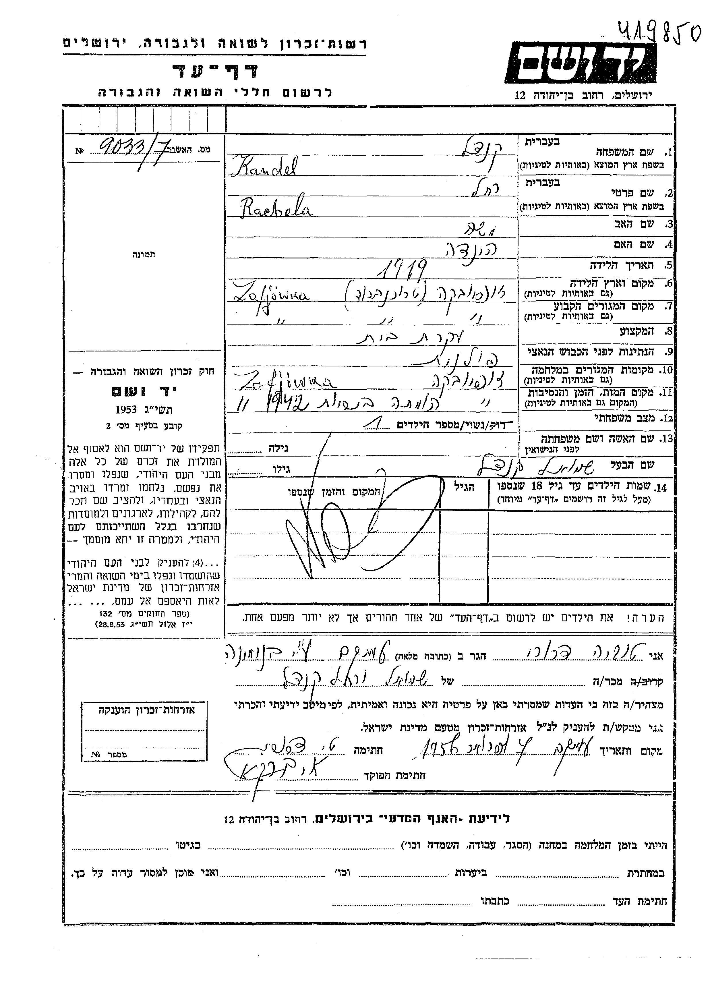 Рахела Кандель, место рождения: Зофьювка, Польша. Отец: Моше, mать:Хинда. Домохозяйка. Женат / замужем. Место жительства до войны: Зофьювка, Польша. Место во время войны: Зофьювка, Польша.