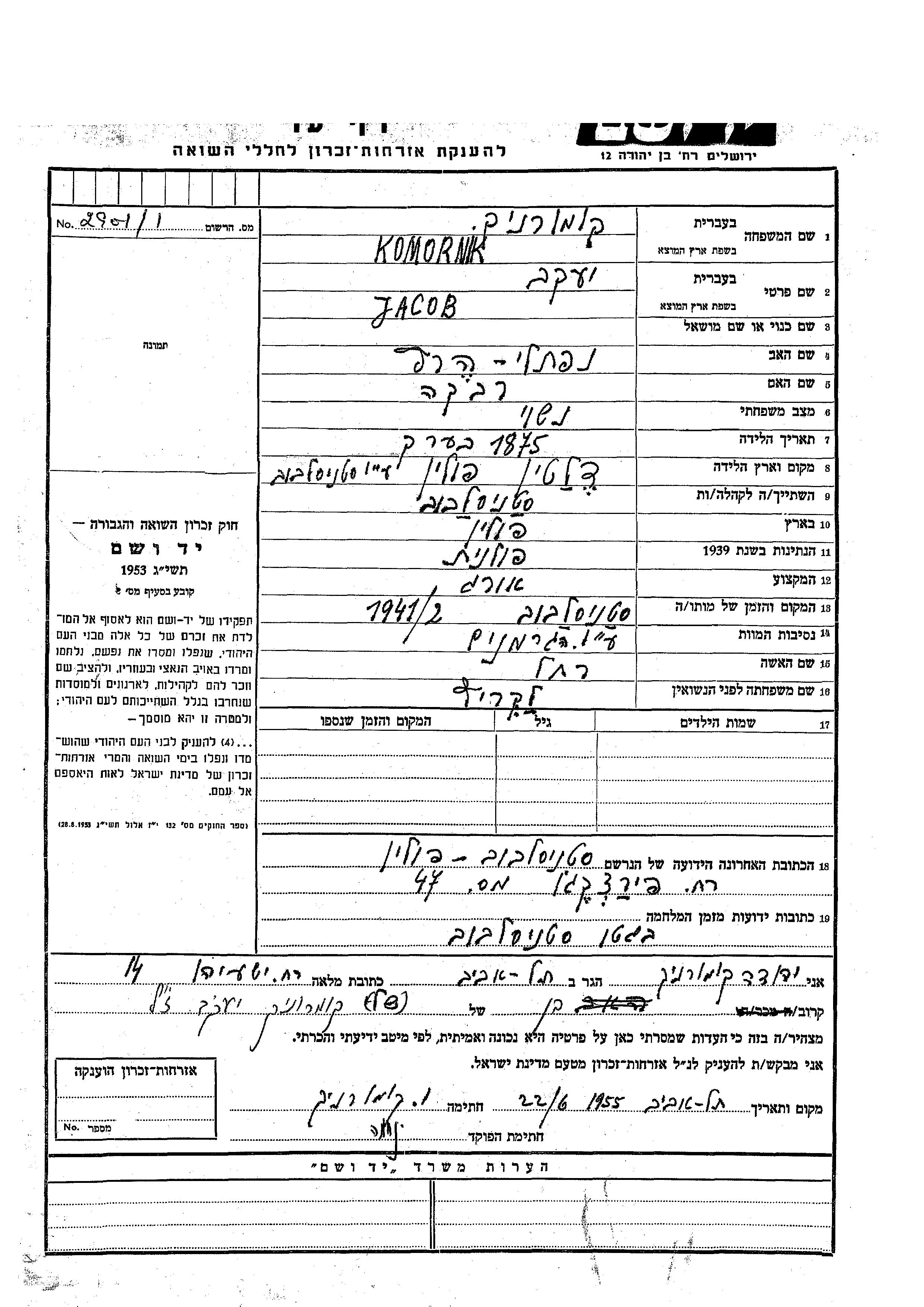 Якоб Коморник, место рождения: Делятин, Польша. Отец: Нафтали Херц, mать:Ривка. Ткач / ткачиха. Место жительства до войны: Станиславув, Польша. Место во время войны: Станиславув, Польша.