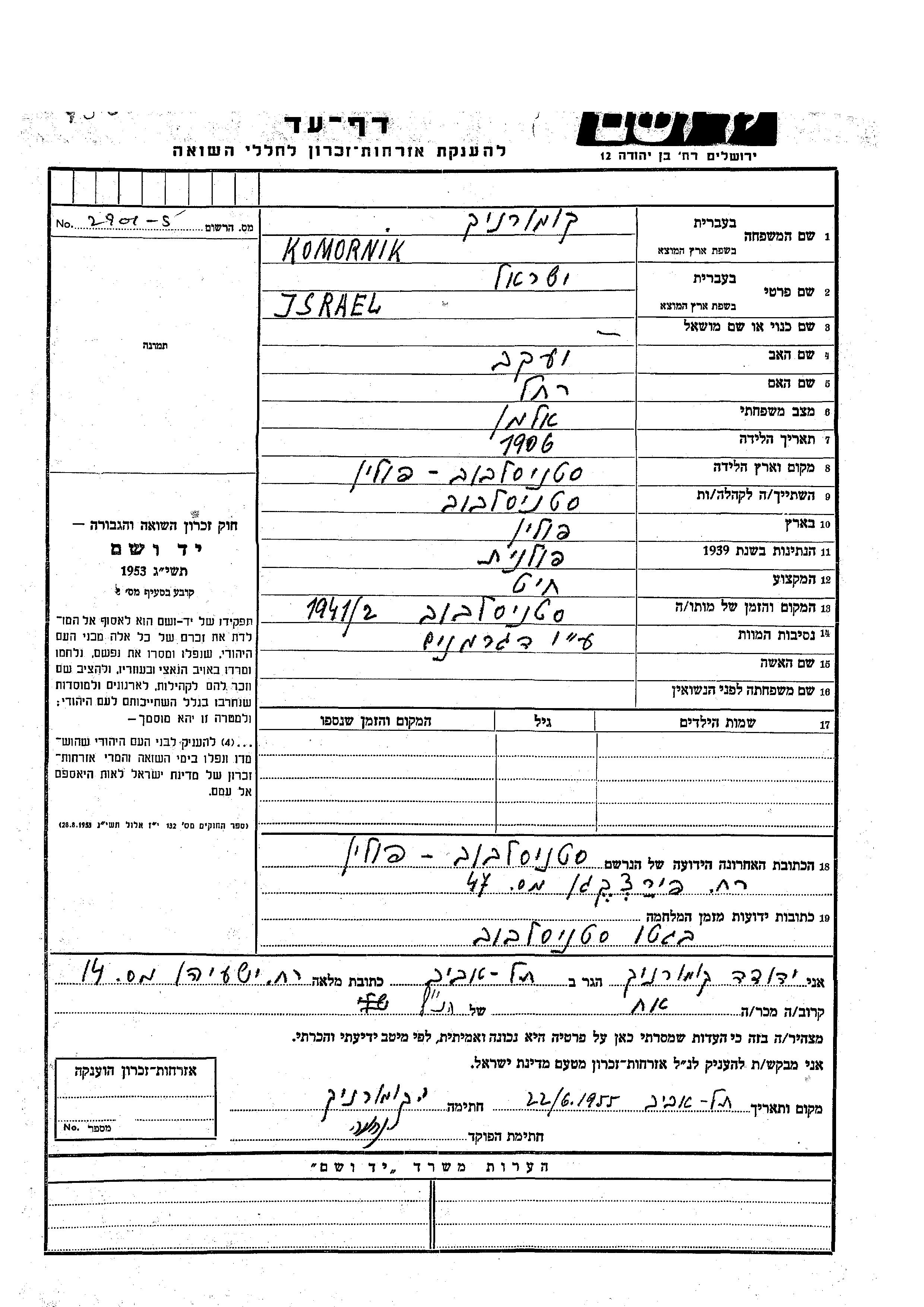 Исраэль Коморник, место рождения: Станиславув, Польша. Отец: Яков, mать:Рахель. Портной / портниха. Место жительства до войны: Станиславув, Польша. Место во время войны: Станиславув, Польша.