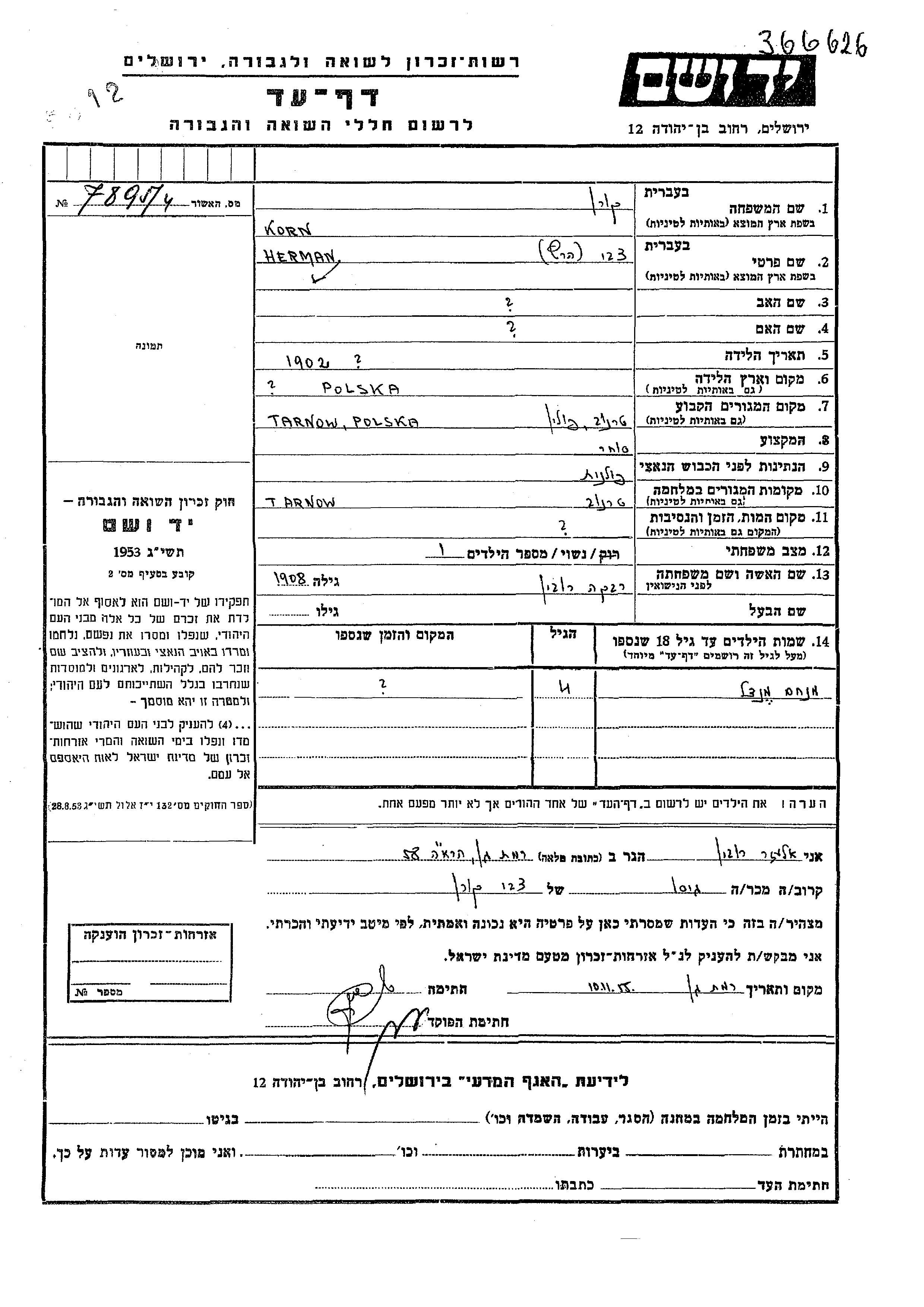 Корн Херман Цви Херц 1902 Тарнув, Польша Лист свидетельских показаний
