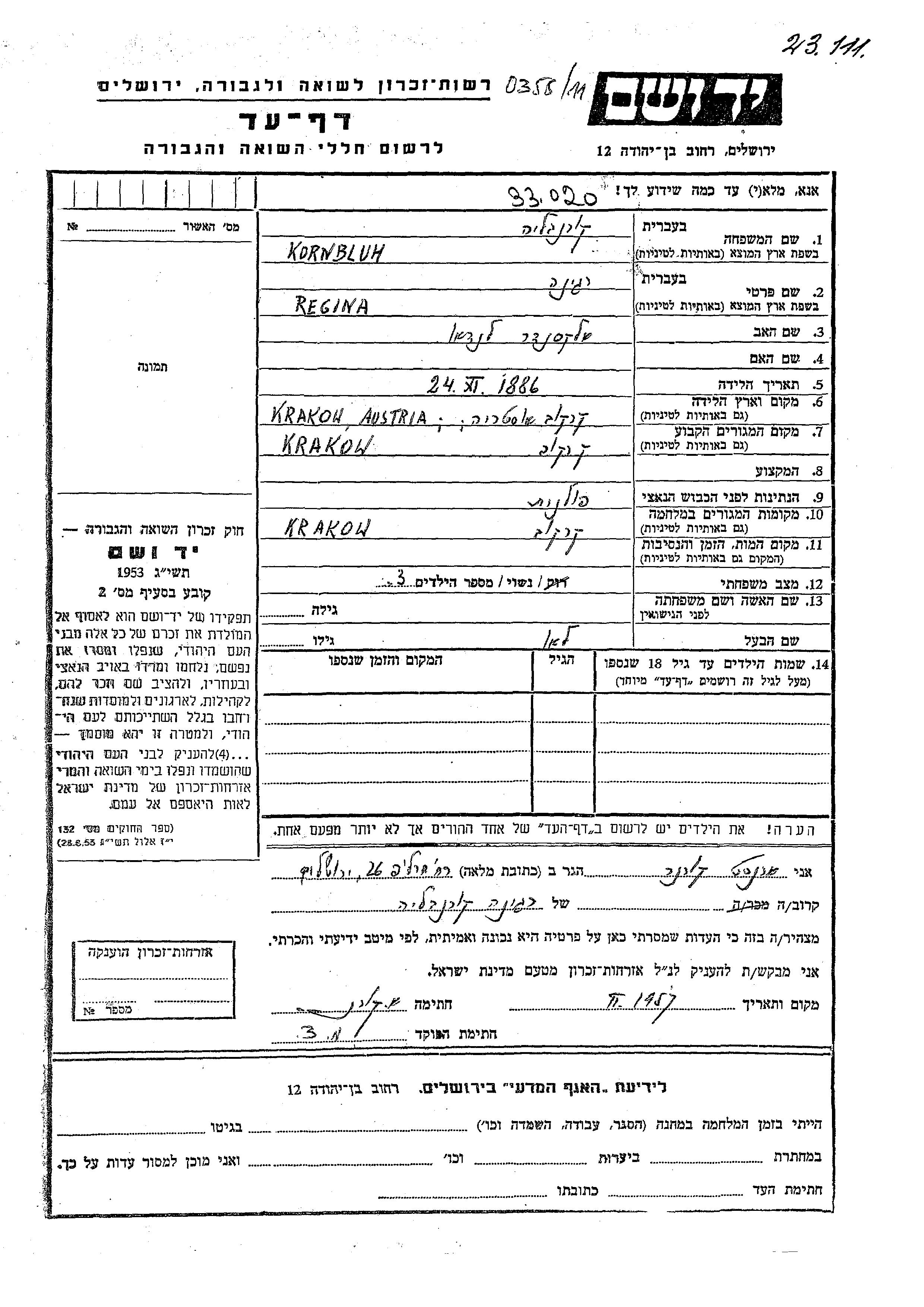 Корнблюм Регина 1886 Краков, Польша Лист свидетельских показаний