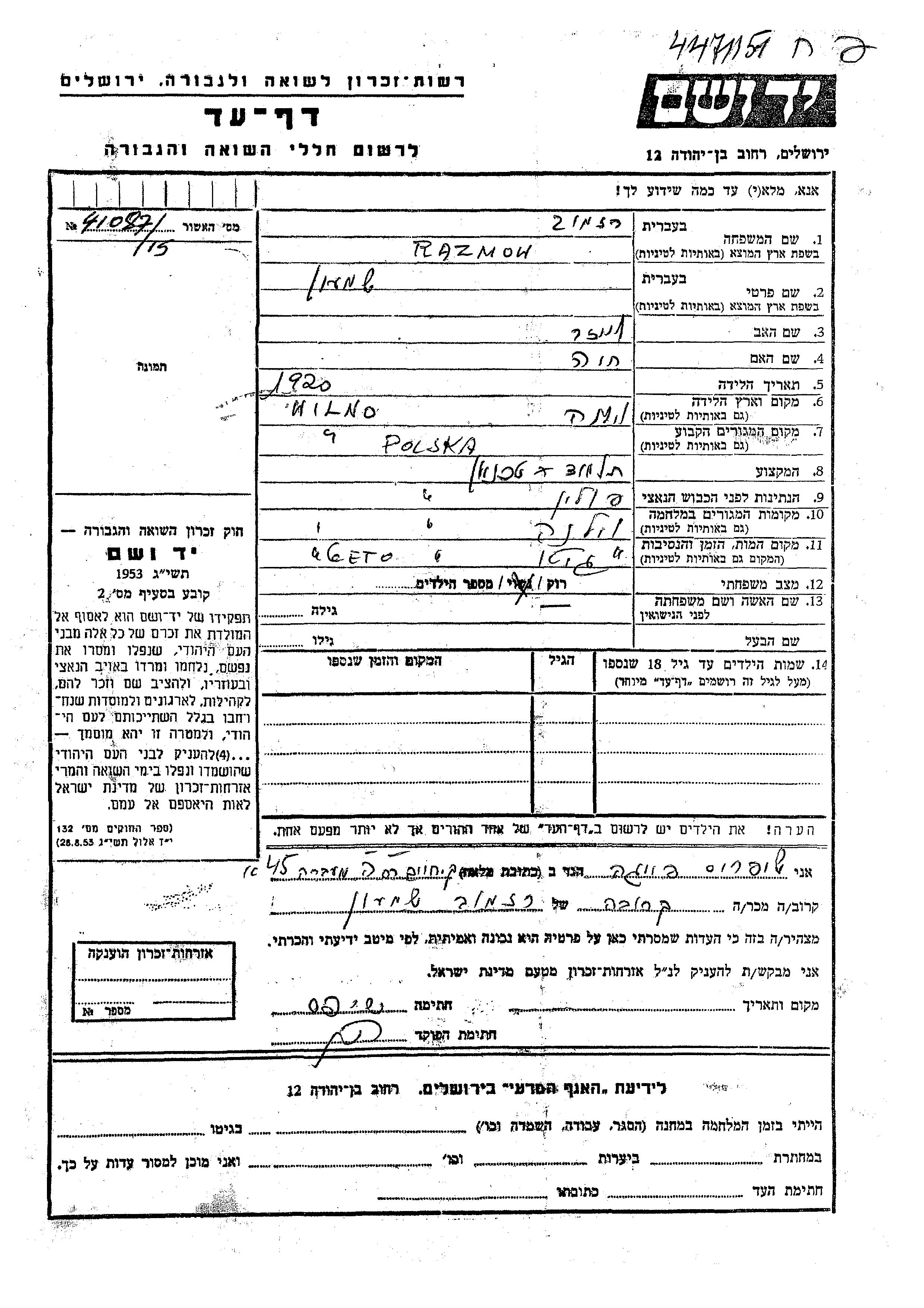 Шимон Размов, место рождения: Вильно, Польша. Отец: Лейзер, mать:Хая. Ученик / ученица. Холост / не замужем. Место жительства до войны: Вильно, Польша. Место во время войны: Вильно, Польша.